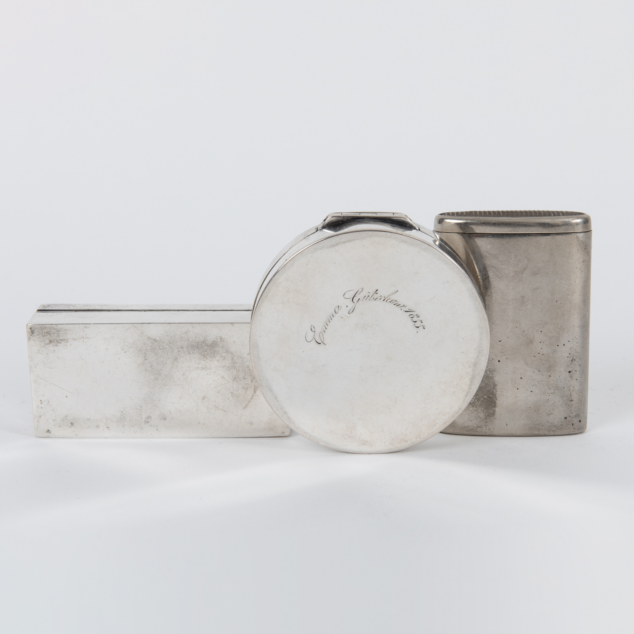 Verschiedene Silberlegierungen; Gesamtgewicht: ca. 171 g; 3-teiliges Konvolut bestehend aus: 1) Streichholzschachtel in oval-länglicher Form mit ausziehbarem goldfarbenem Schub, Daumenrast, oberhalb eingelegter Reibefläche und aufgelegter Emaille-Flagge des Rudervereins Allemannia aus Hamburg, darunter graviertes Datum „3. Mai 1926“; Maße: ca. 6,2 x 6,3 x 4,3 cm. 2) Dose in rechteckiger Form mit abklappbarem Deckel, Daumendrücker und erhabener Abbildung des Schnelldampfers Kaiser Friedrich auf der Schauseite; innen Restvergoldung; Maße: ca. 2 x 7,2 x 3,5 cm. 3) Runde Dose mit abklappbarem Deckel und Widmungen auf beiden Seiten; innen Restvergoldung und ungedeutete Punze; Durchmesser: ca. 6,4 cm. Altersbedingte Gebrauchsspuren und Oxidationsrückstände.