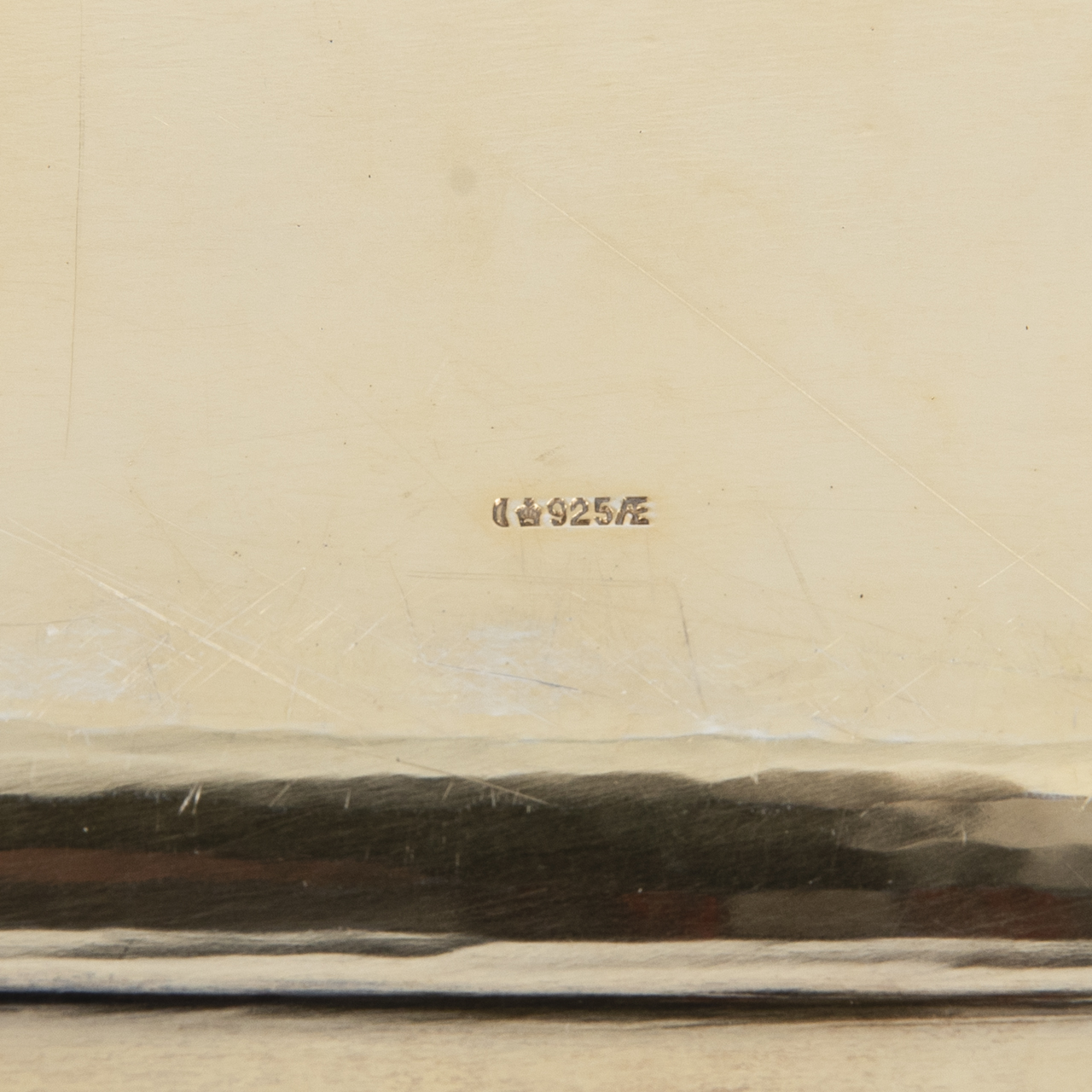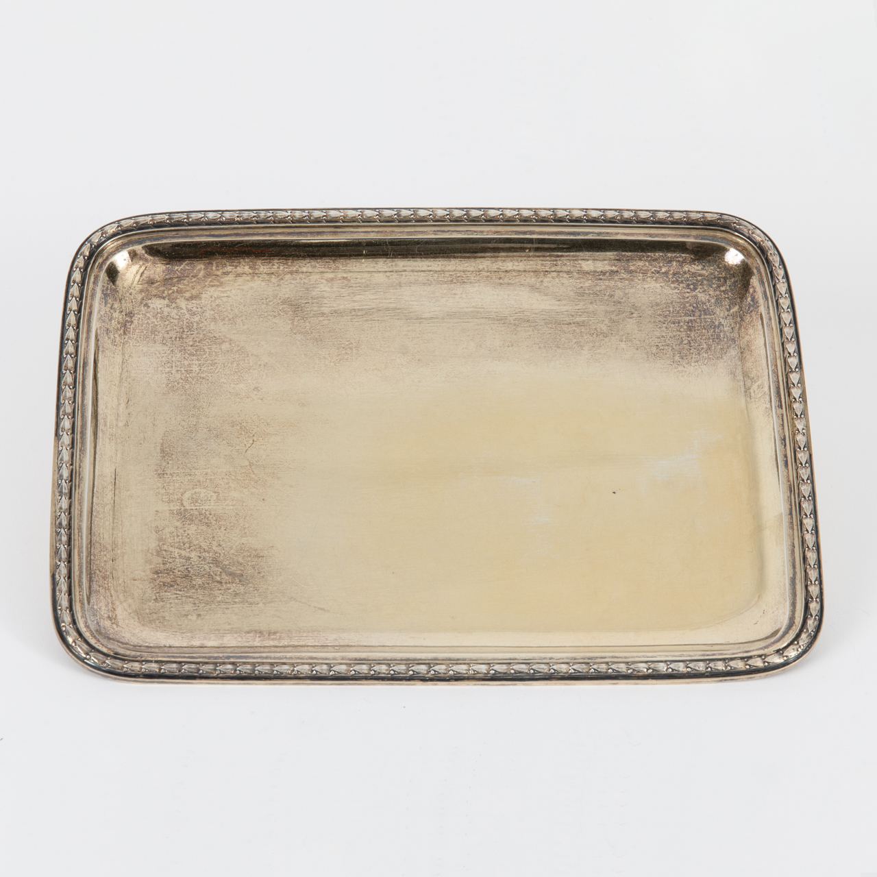 925/- Silber; Gewicht: ca. 453 g; kleines Anbiettablett in gerundet rechteckiger Form mit leicht ausgestellter, getreppter Fahne und umlaufendem, erhabenem Lorbeerdekor am Rand; starker Goldabrieb und altersbedingte Gebrauchsspuren; unterseitig gestempelt mit Halbmond und Krone, ungedeuteter Meistermarke und Feingehaltsstempel; Maße: ca. 23,2 x 17,1 cm.