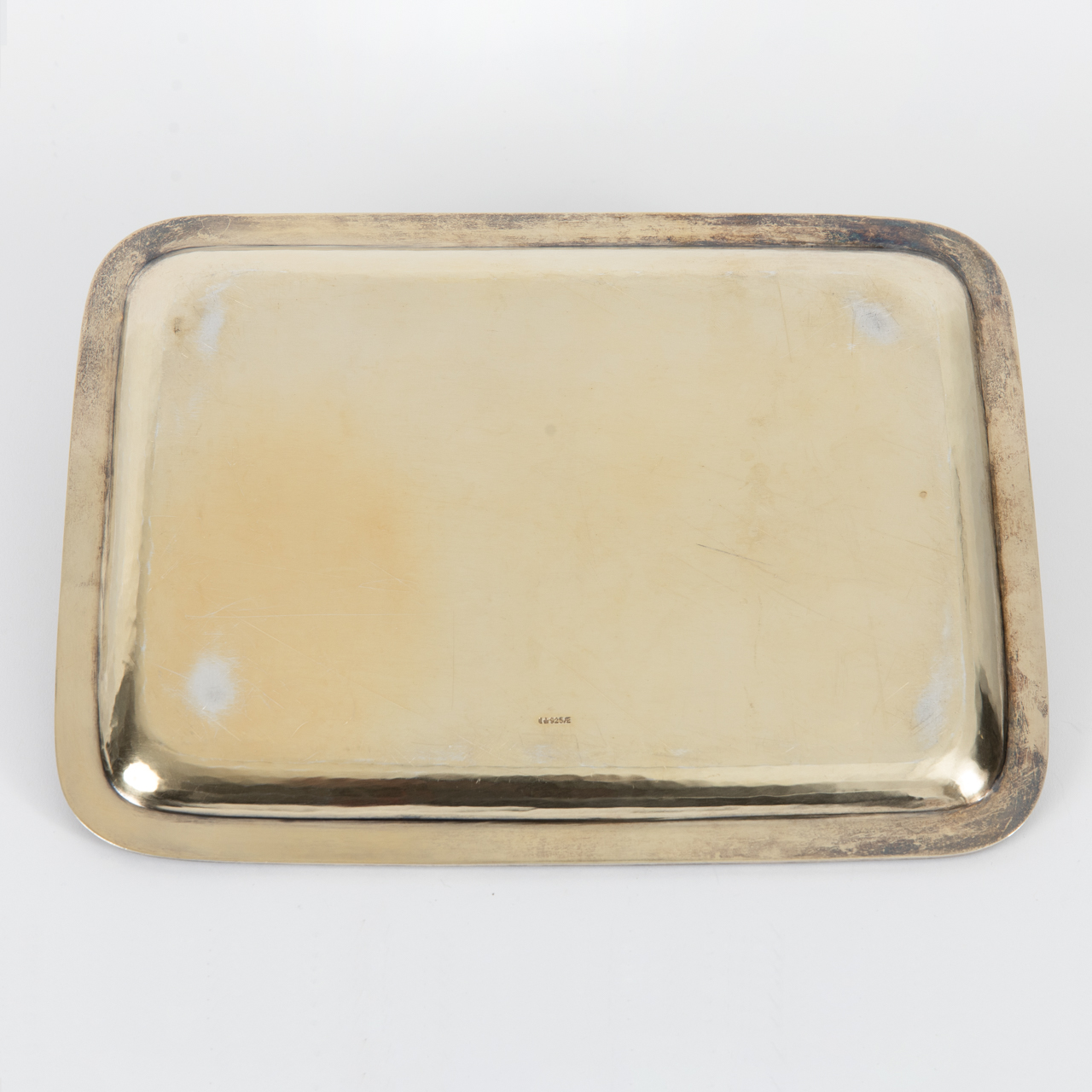 925/- silver; weight: approx. 453 g; small serving tray of rounded rectangular form with slightly flared, stepped rim and encircling raised laurel decoration to the edge; heavy wear to the gilding and age-related signs of use; underside stamped with crescent and crown, unidentified maker’s mark and fineness mark; dimensions: approx. 23.2 x 17.1 cm.