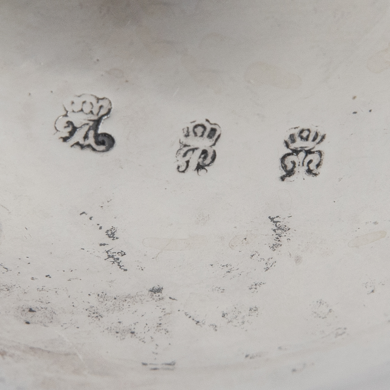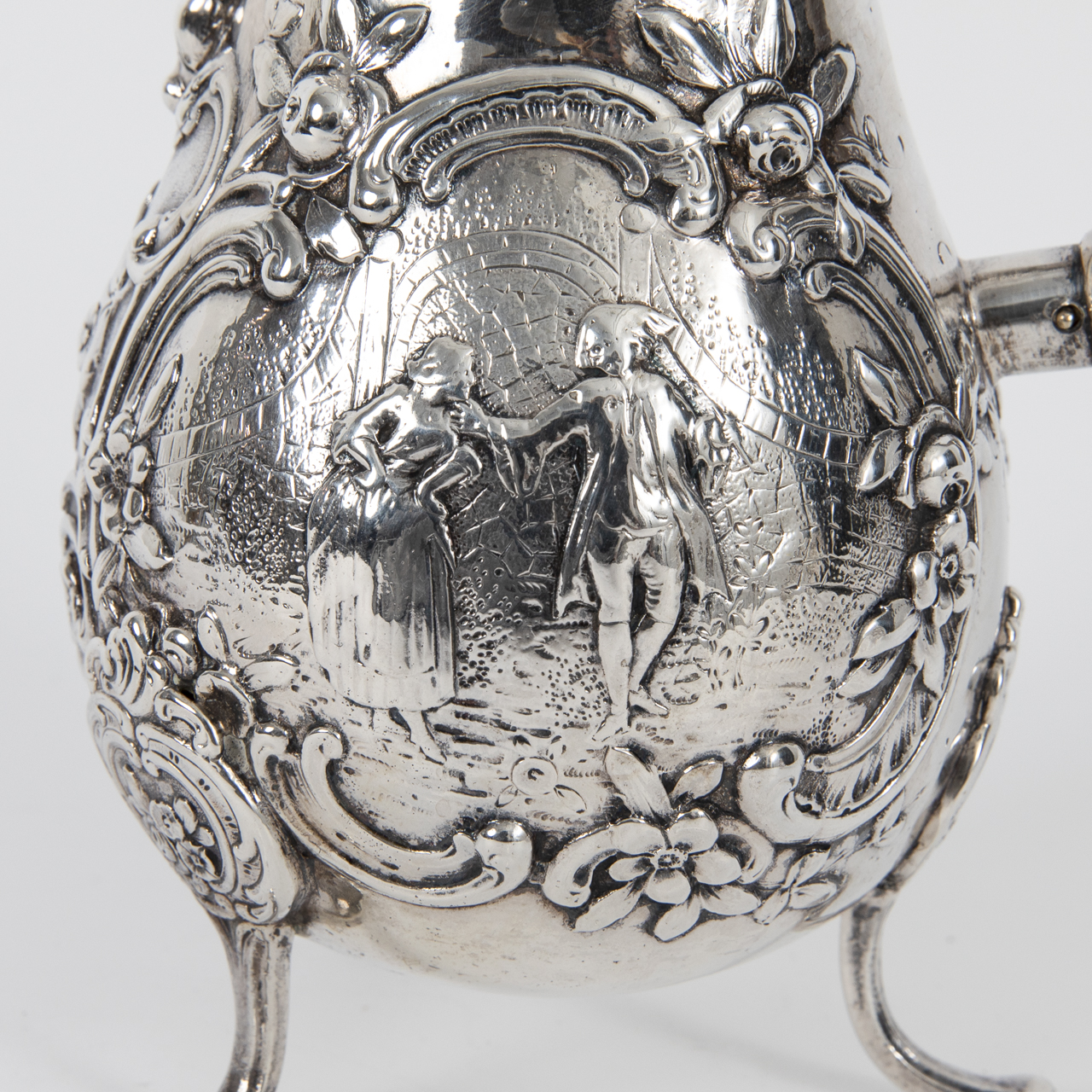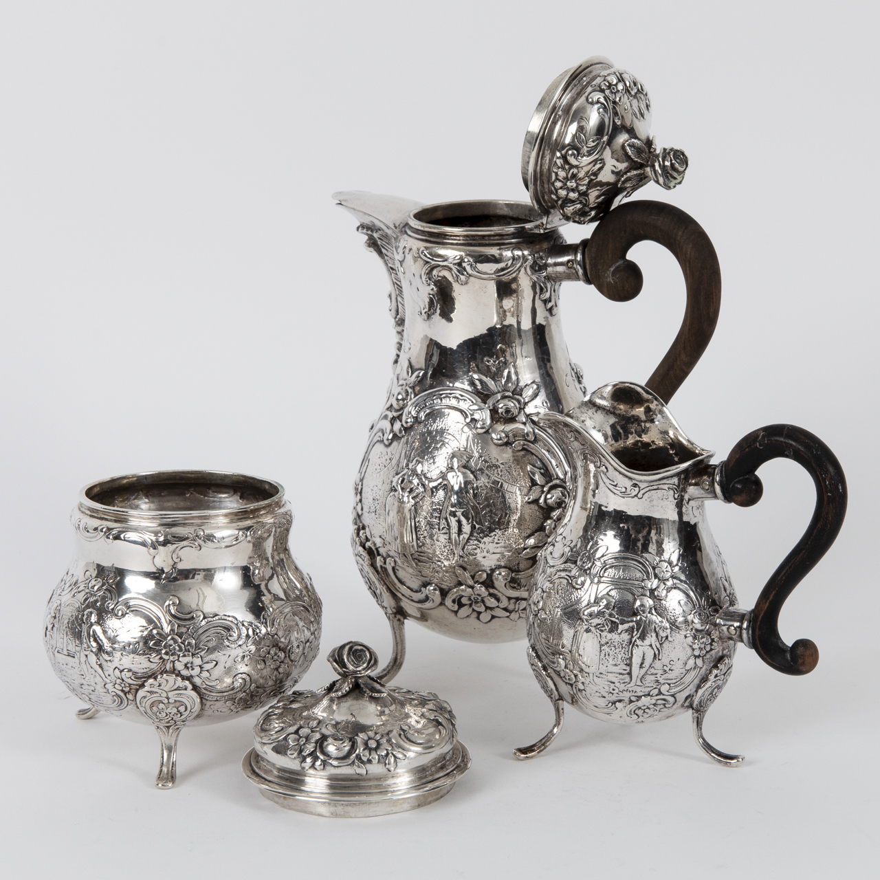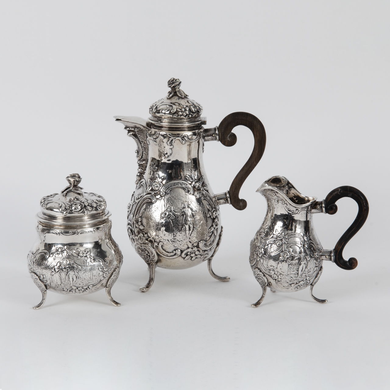 Silver alloy; total weight: approx. 1134 g; three-piece coffee service with encircling relief floral and rocaille decoration to the front and several large reserves with Watteau-style scenes: 1) Coffee pot with pear-shaped body on three splayed feet, scrolled ear handle of ebonised wood (upper attachment requires tightening), hinged domed lid with rose finial and high-set spout; height: approx. 22.5 cm. 2) Cream jug with pear-shaped body on three splayed feet, high-set scrolled ear handle of ebonised wood and broad spout; height: approx. 12.7 cm. 3) Sugar bowl with compressed globular body on three scrolled feet and removable lid with rose finial; height: approx. 13.2 cm. All pieces with age-related signs of wear; underside stamped with crowned Bourbon fleur-de-lis and two town or poinçon de charge marks “A” and “P” beneath a trefoil crown (see photos).