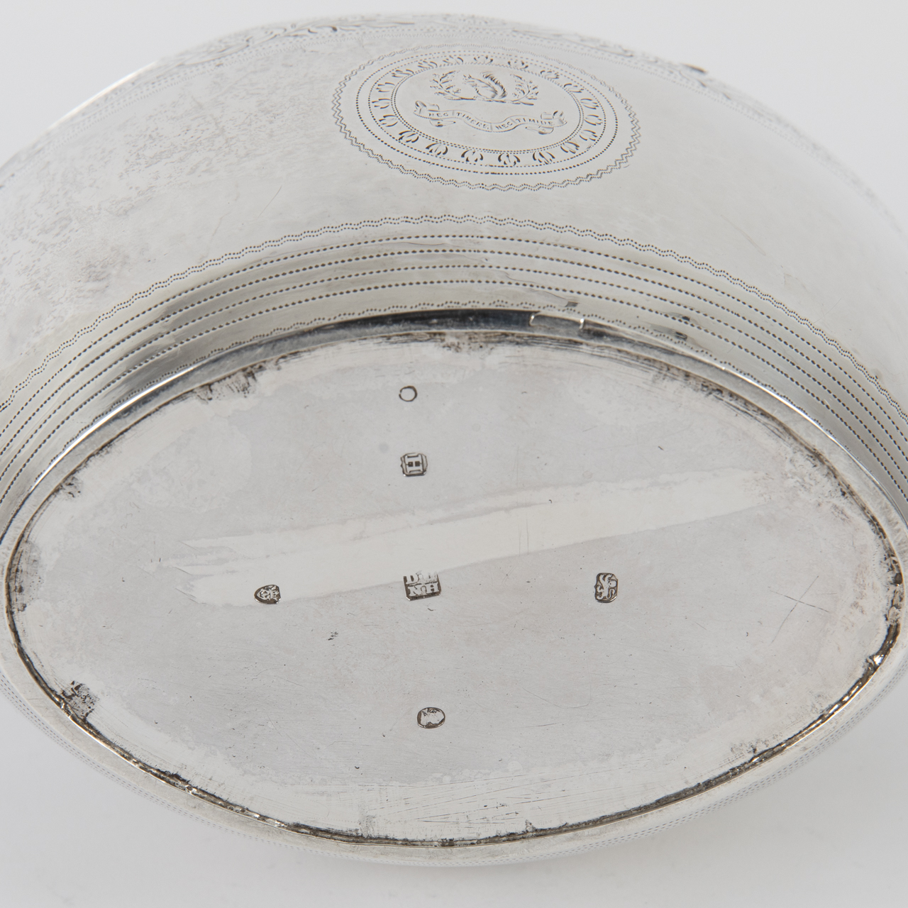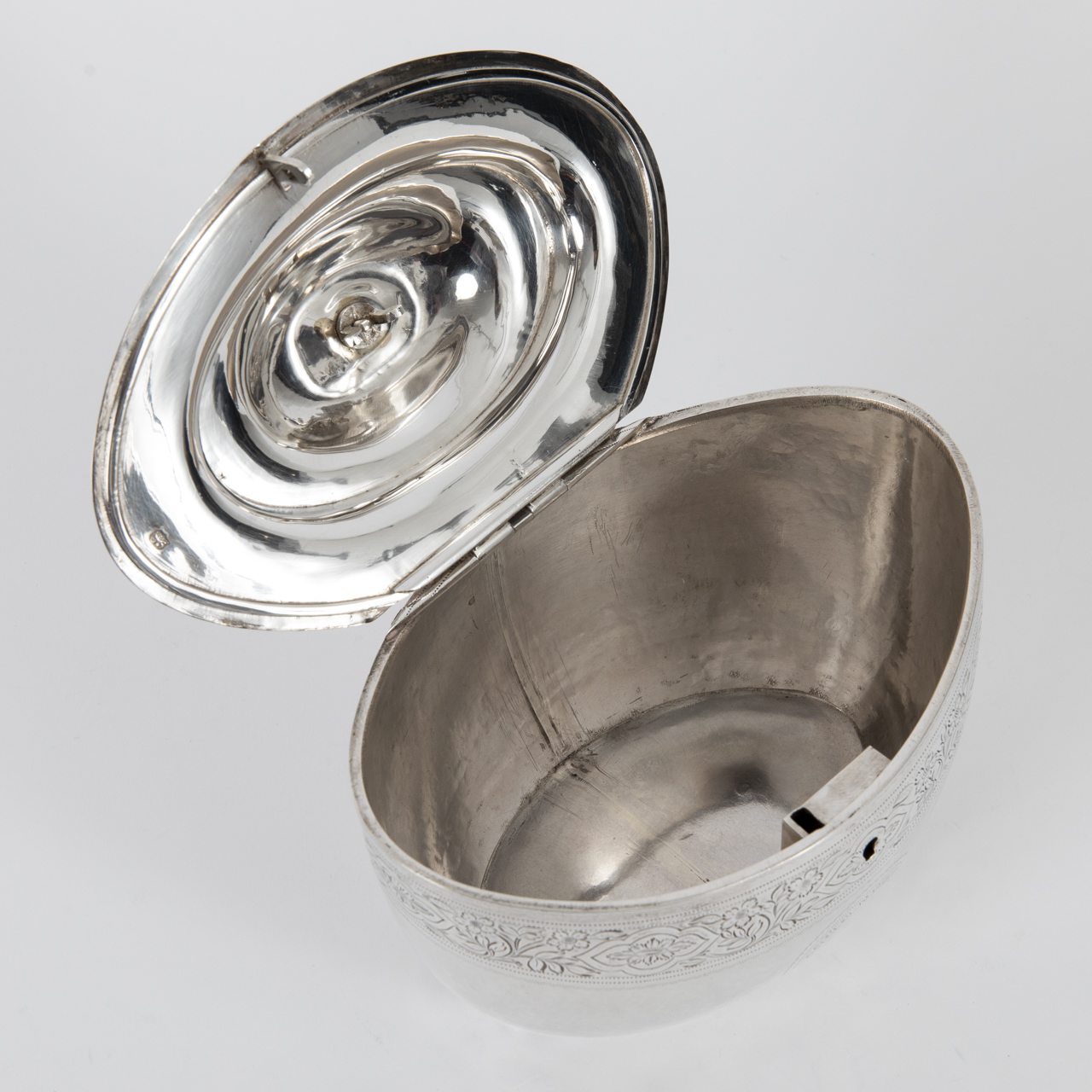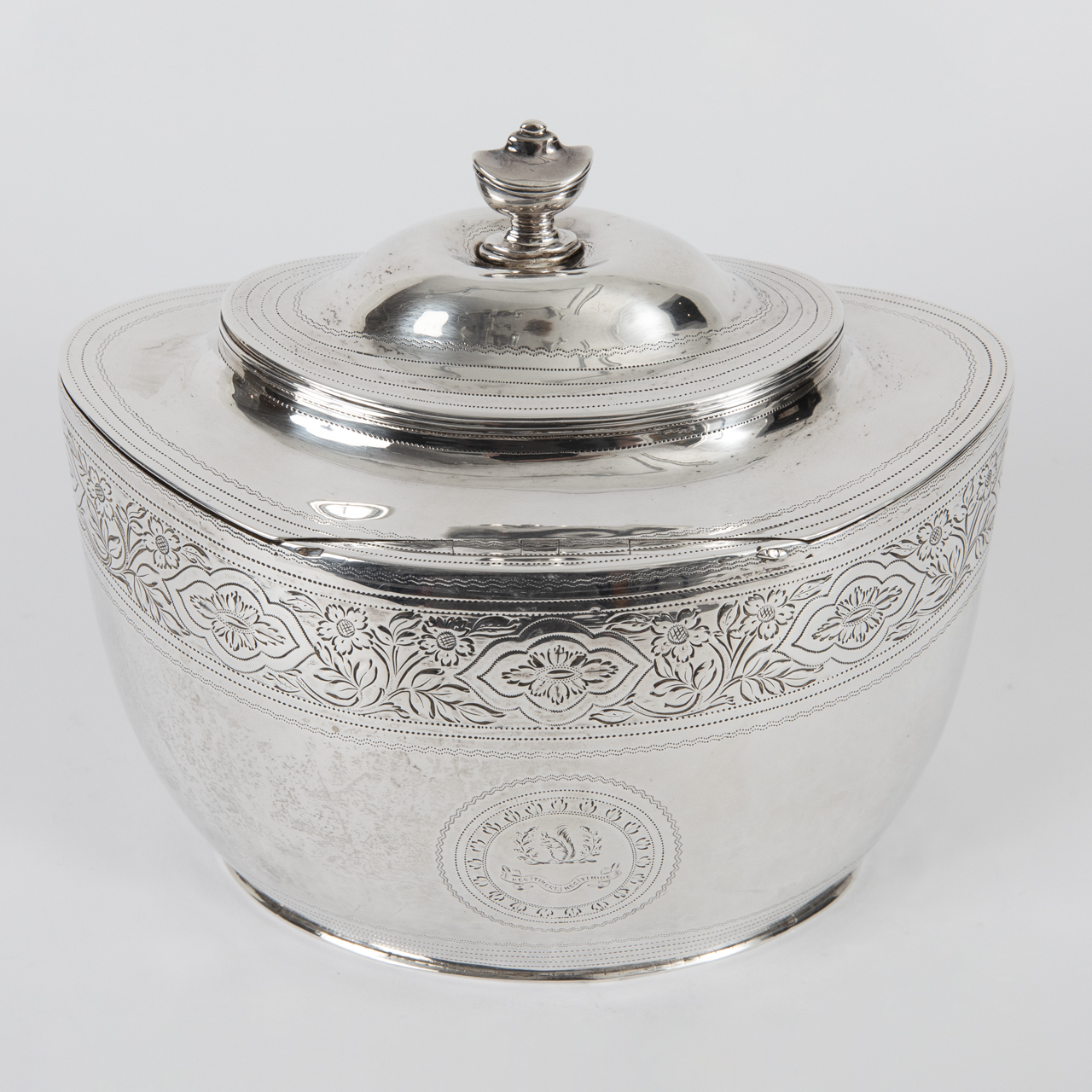 Sterling silver; weight: approx. 412 g; ovoid sugar box on a narrow foot ring with raised shoulder, hinged profiled lid at the rear and mushroom-shaped finial; centrally inset keyhole to the front, key missing; encircling border with floral decoration and chased linear ornament to the body, a circular reserve centred on both the front and reverse, the reverse engraved with the Latin motto “NEC TIMERE NEC TIMIDE”; lid with fine encircling chased decoration; age-related signs of wear, lid finial probably later added and showing an irregular depression; lid stamped with lion passant, underside stamped with lion passant, duty mark, London town mark, unidentified maker’s mark and date letter; dimensions: approx. 14.6 x 14.6 x 10.5 cm.