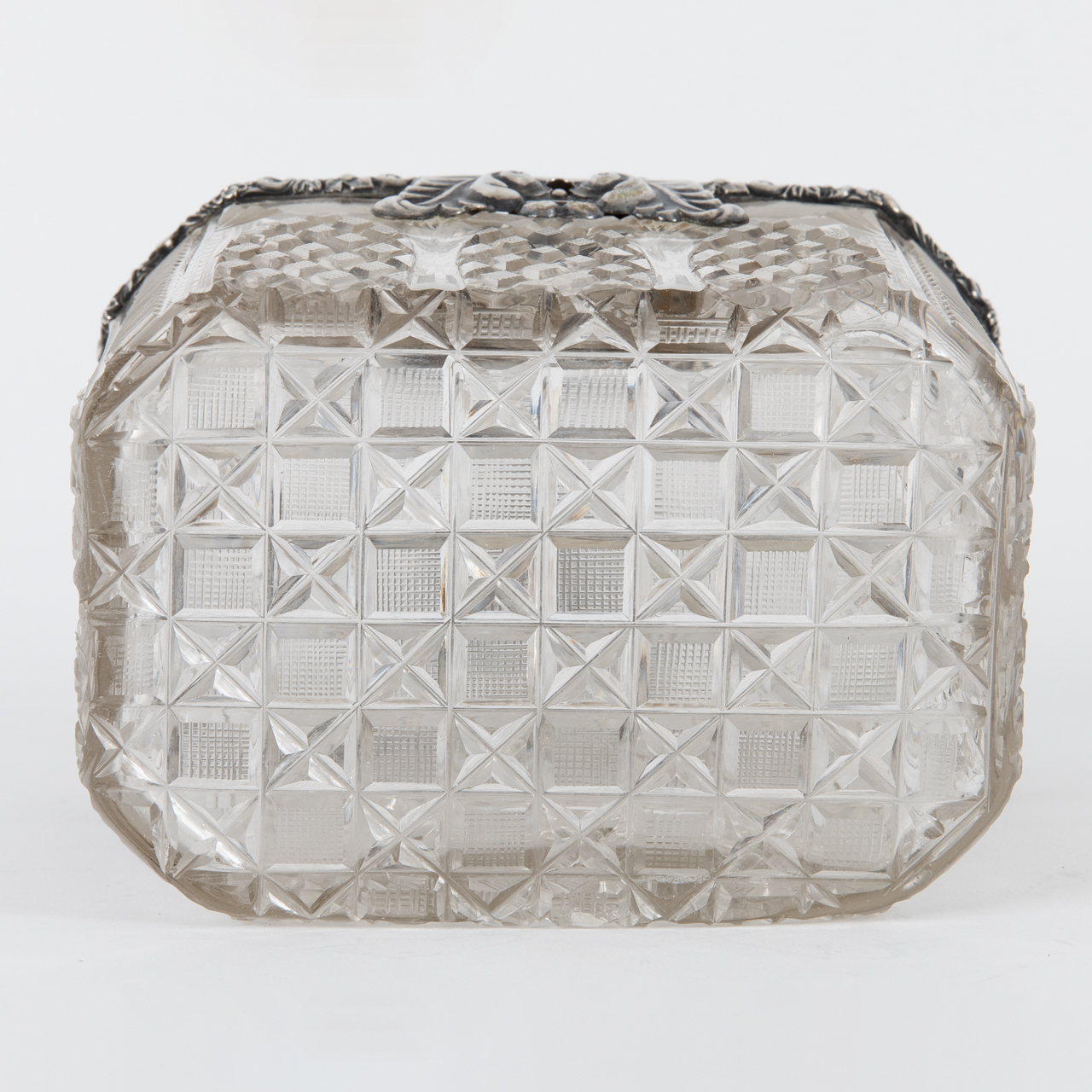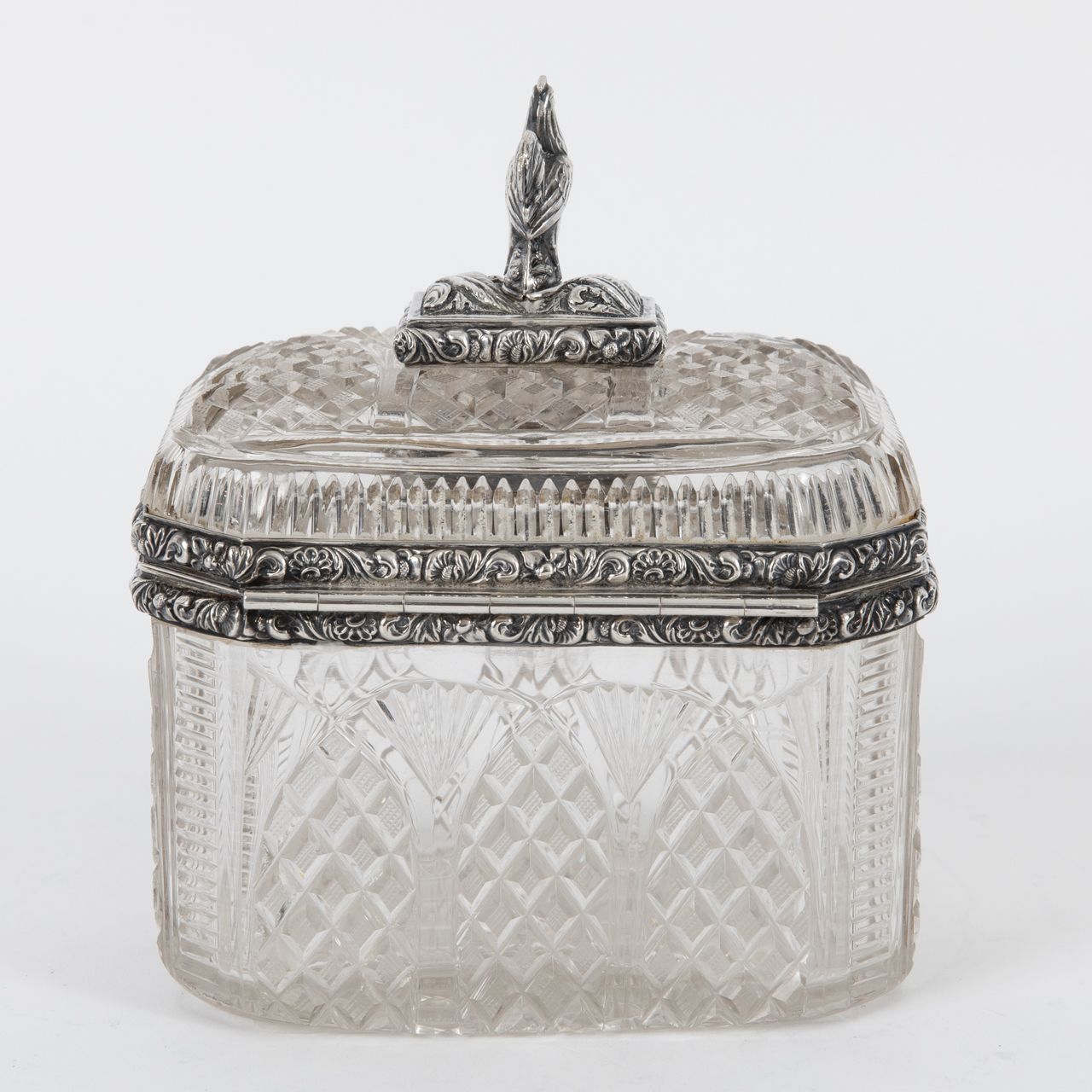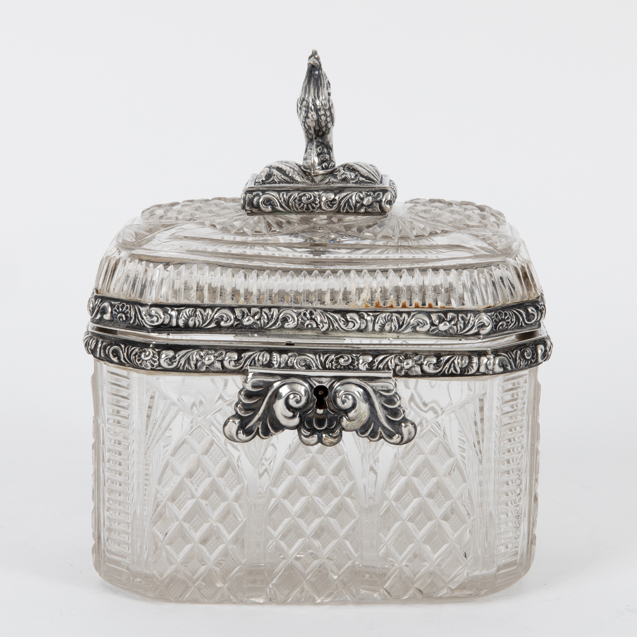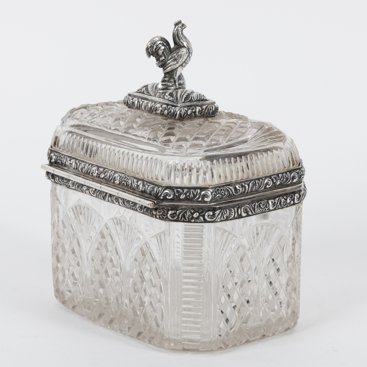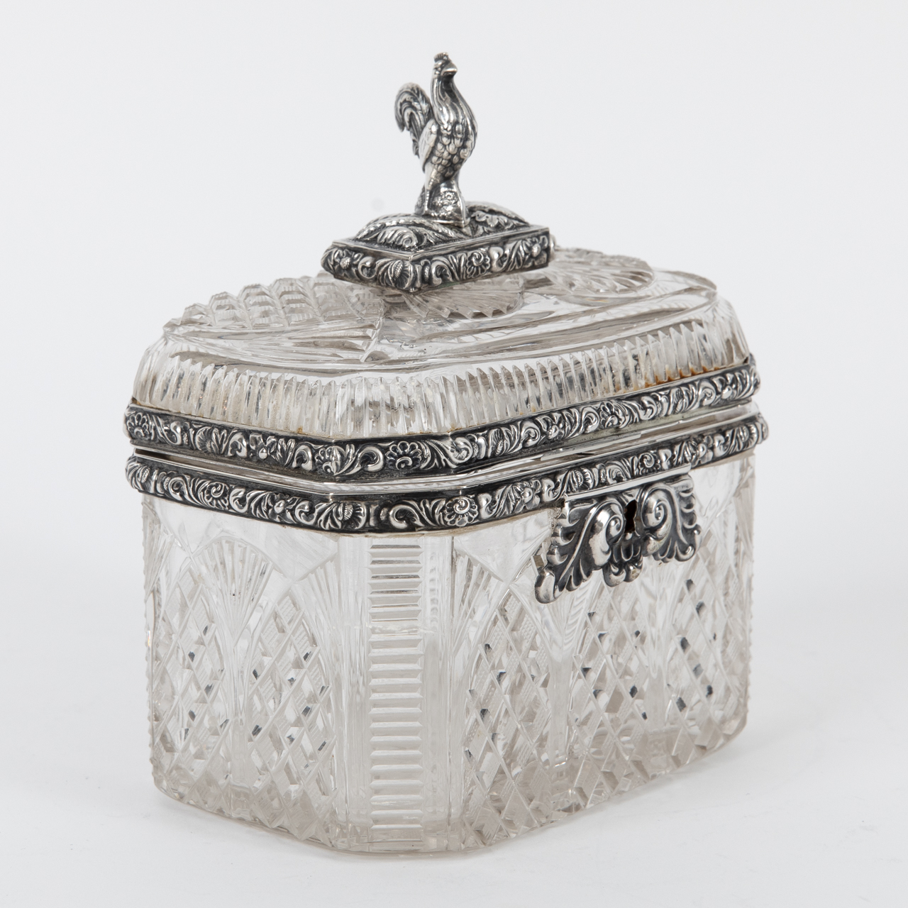 Silver alloy; total weight: approx. 926 g; octagonal sugar box made of crystal glass cut in various ornamental patterns, with silver rim mount and finial; straight-sided body with rear-hinged domed lid surmounted by a sculptural, stylised rooster finial; centrally inset keyhole to the front, key missing; age-related signs of wear and discolouration; dimensions: approx. 11 x 13.2 x 9.1 cm.