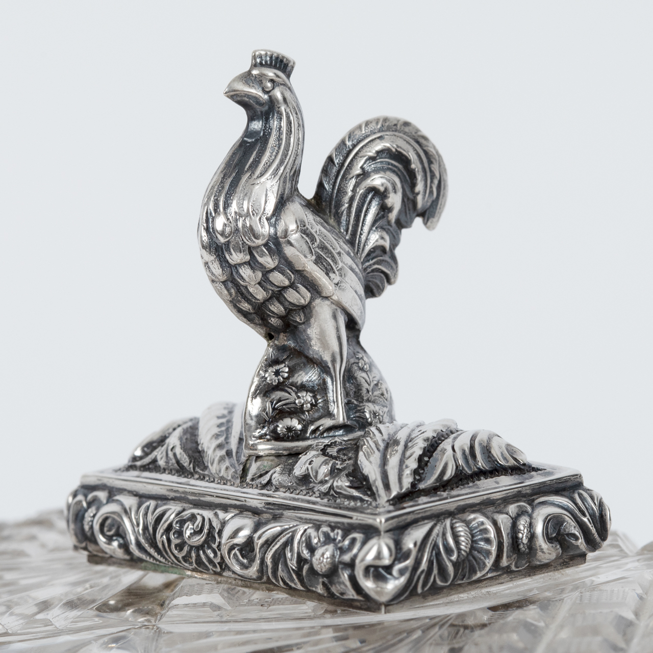 Sugar box made of crystal glass with silver rooster finial, France, 19th century