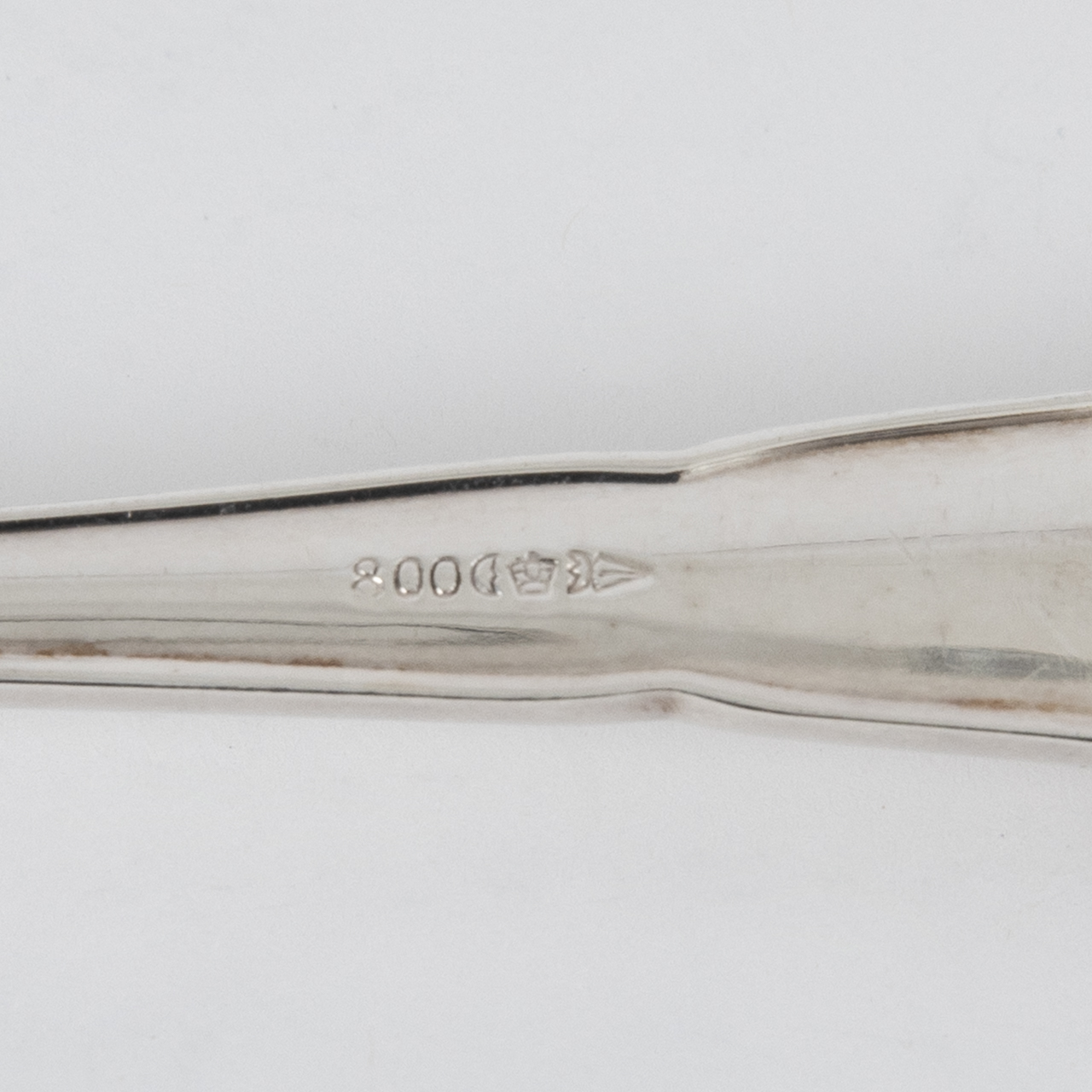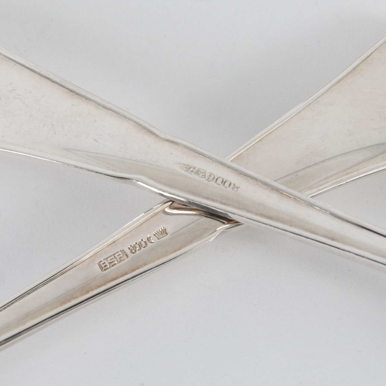 800/- silver; total weight: approx. 647 g; fish cutlery set for seven persons with classic Chippendale decoration; minimal age-related signs of wear; stamped to the reverse of the handles with crescent and crown, maker’s mark and fineness mark; length of the forks: approx. 17.5 cm; length of the knives: approx. 21.3 cm.