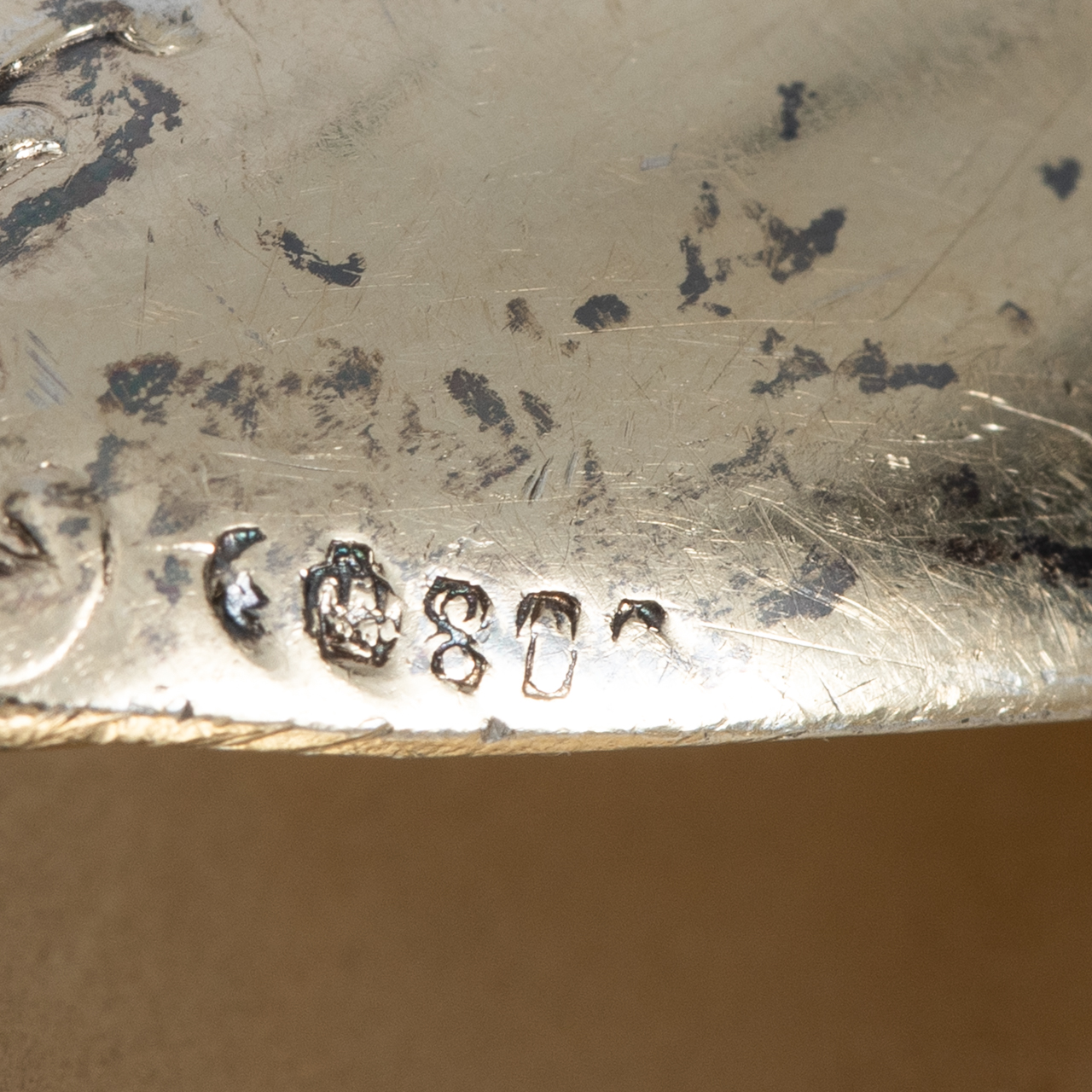 800/- Silber; Gesamtgewicht: ca. 101 g; Paar historistischer Kompottlöffel mit ziseliertem Floraldekor am Steg, Schaft in Form eines Putto, der das Stilende in Rocailleform mit Floraldekor hält; rückseitig das Dekor spiegelbildlich ausgeführt; altersbedingter Goldabrieb und Verfärbungen; rückseitig am Laffen mit Halbmond und Krone sowie Feingehaltsstempel versehen; Länge: ca. 20,1 cm.