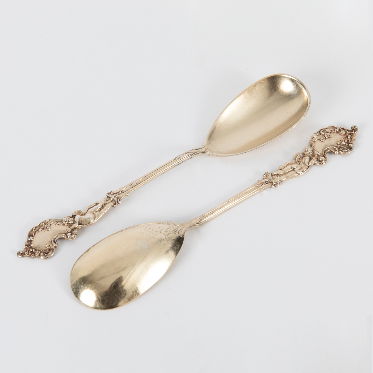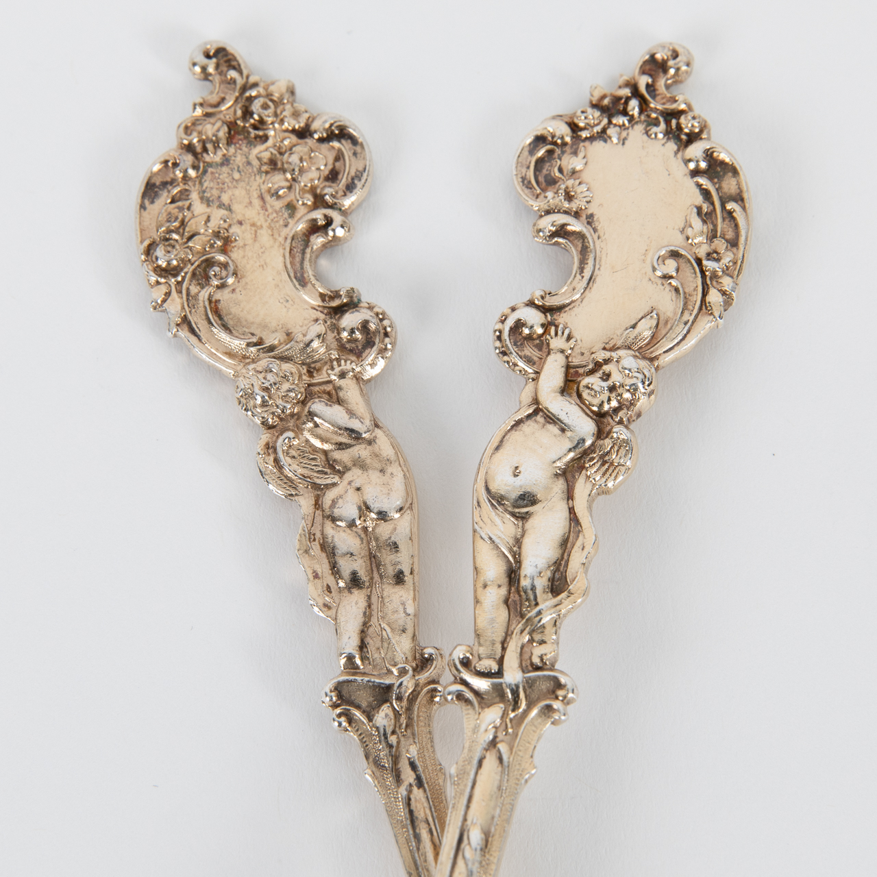 800/- silver; total weight: approx. 101 g; pair of Historicist compote spoons with chased floral decoration to the stem, the handle formed as a putto holding the handle end in rocaille form with floral decoration; decoration repeated on the reverse; age-related wear to the gilding and discolouration; reverse of the bowls stamped with crescent and crown and fineness mark; length: approx. 20.1 cm.