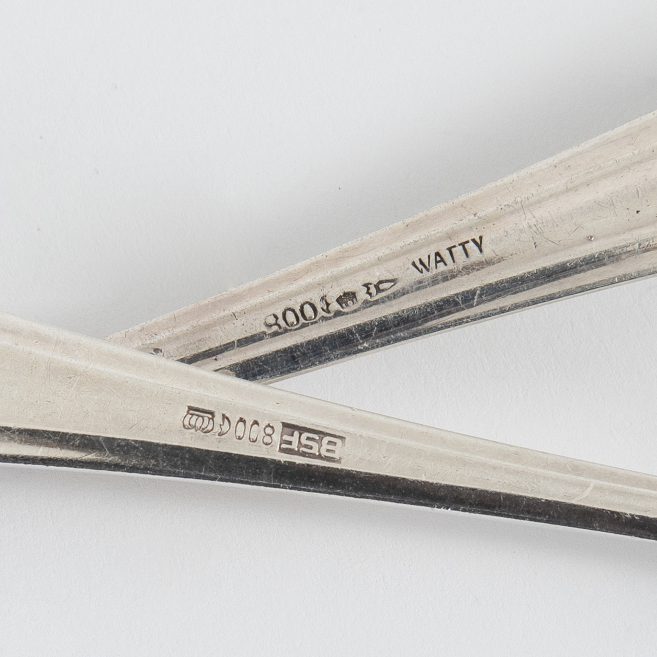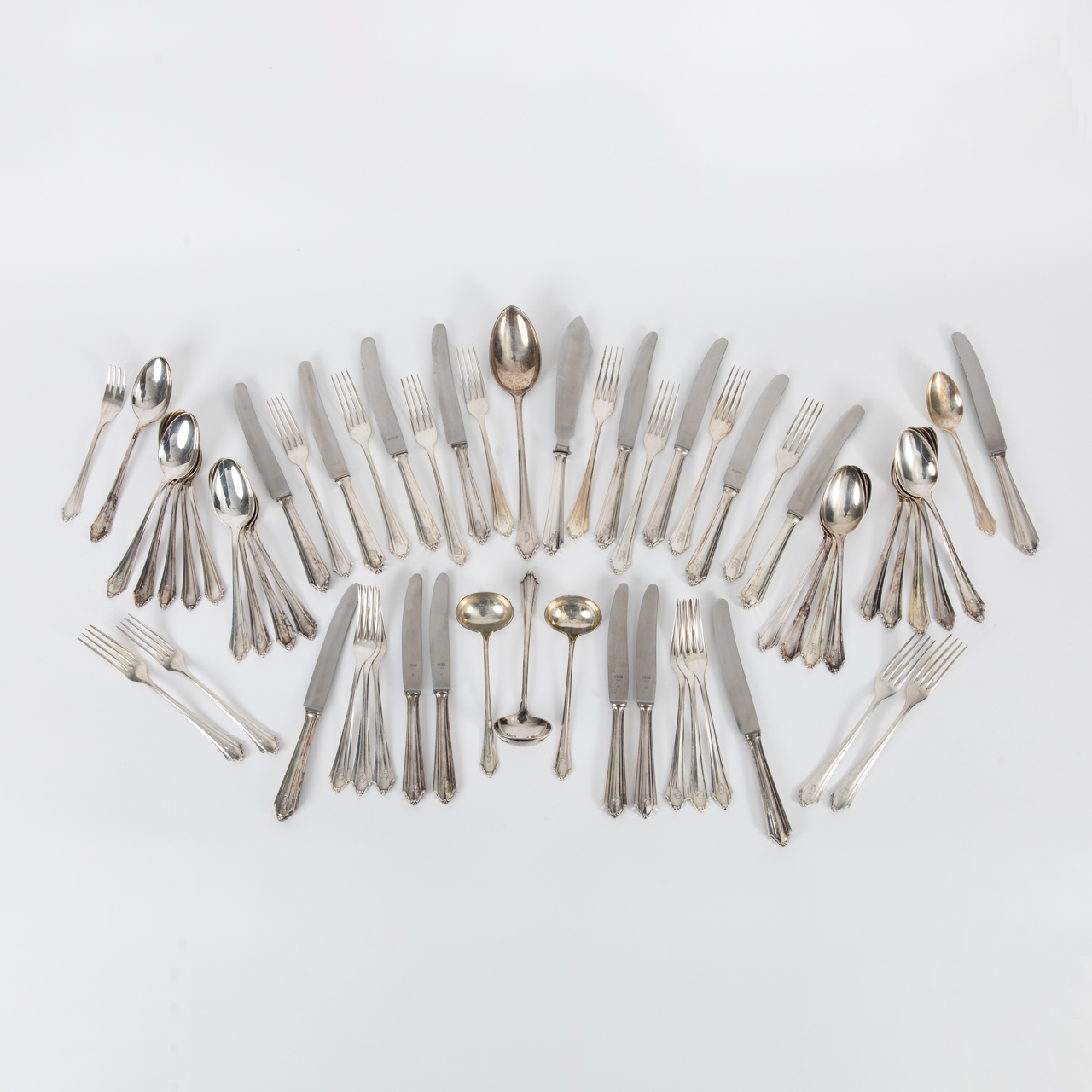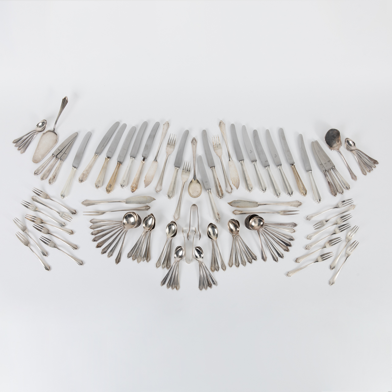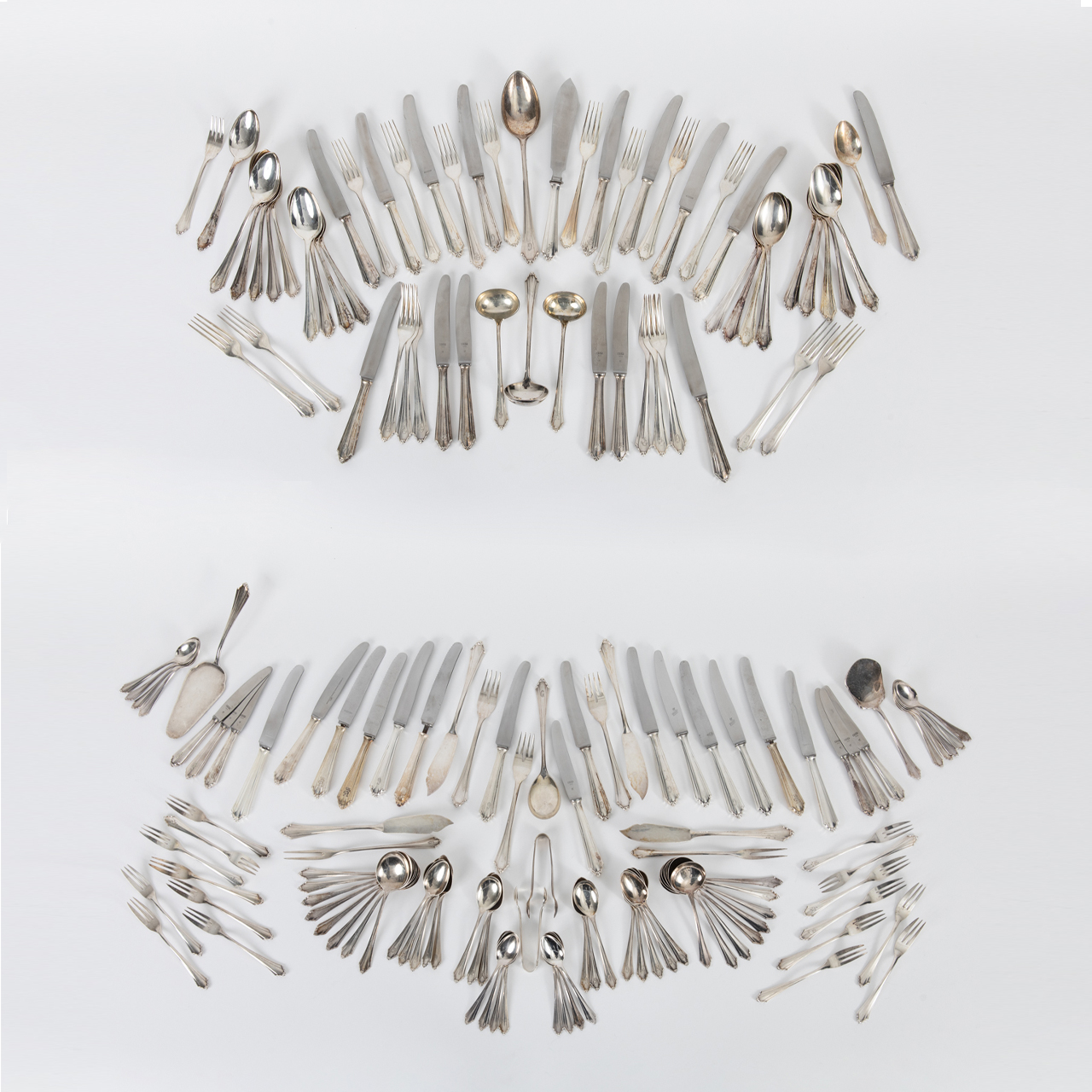 800/- silver; total weight: approx. 5 kg; 159-piece group with various monograms (“G”, “JR”, “JG”, “JH”, “FR”, “JS”) to the ends of the handles, comprising: 15 table knives (L: approx. 25.5 cm), 15 menu knives (L: approx. 21.4 cm), compote spoons (L: approx. 8.8 cm), bouillon spoons (L: approx. 13.5 cm), menu spoons (L: approx. 18.5 cm), cake server (L: approx. 21.8 cm), pair of sugar tongs (L: approx. 10.6 cm), pair of serving forks (L: approx. 19 cm), pastry server (L: approx. 17 cm), cake knife (L: approx. 27.3 cm), 3 ladles (L: approx. 21.4 cm), large serving spoon (L: approx. 27.8 cm), 3 ladles (L: approx. 18.5 cm), 6 ice-cream spoons (L: approx. 13.3 cm), 10 coffee spoons (L: approx. 13.7 cm), 17 teaspoons (L: approx. 12.4 cm), 16 cake forks (L: approx. 14.5 cm), 15 soup cup spoons (L: approx. 15.4 cm), 6 side knives (L: approx. 17.5 cm), 4 fish knives (L: approx. 22 cm), 4 fish forks (L: approx. 18 cm), 18 table forks (L: approx. 21.4 cm), 16 table spoons (L: approx. 21.7 cm); some pieces with engraved inscriptions to the reverse; all pieces stamped to the reverse with crescent and crown, maker’s marks of Wilkens & Söhne or BSF, fineness marks and some with retailer’s marks, incl. Watty; age-related signs of wear, minor deformations and oxidation residues; five knives require re-cementing.