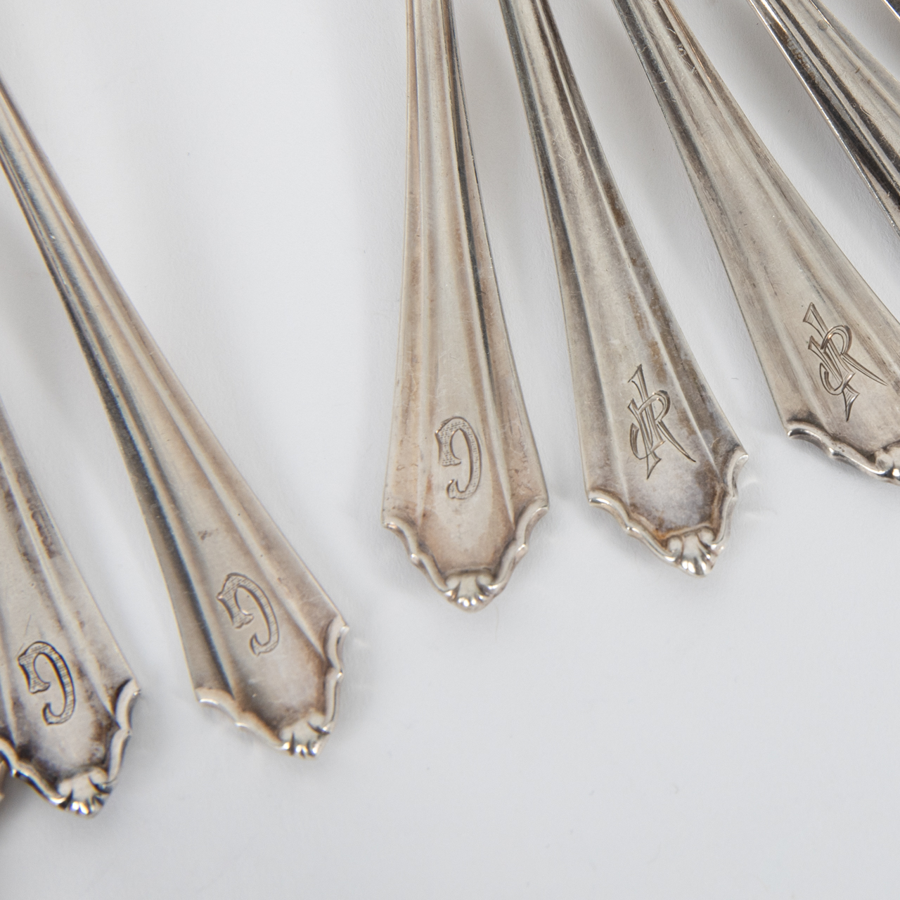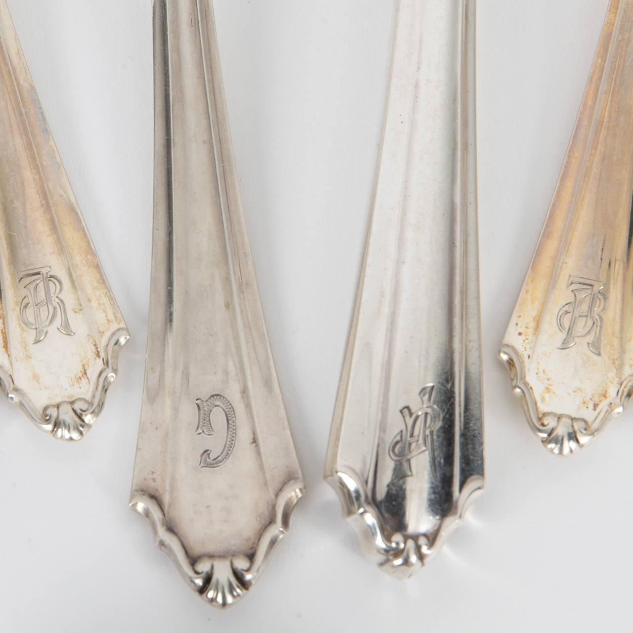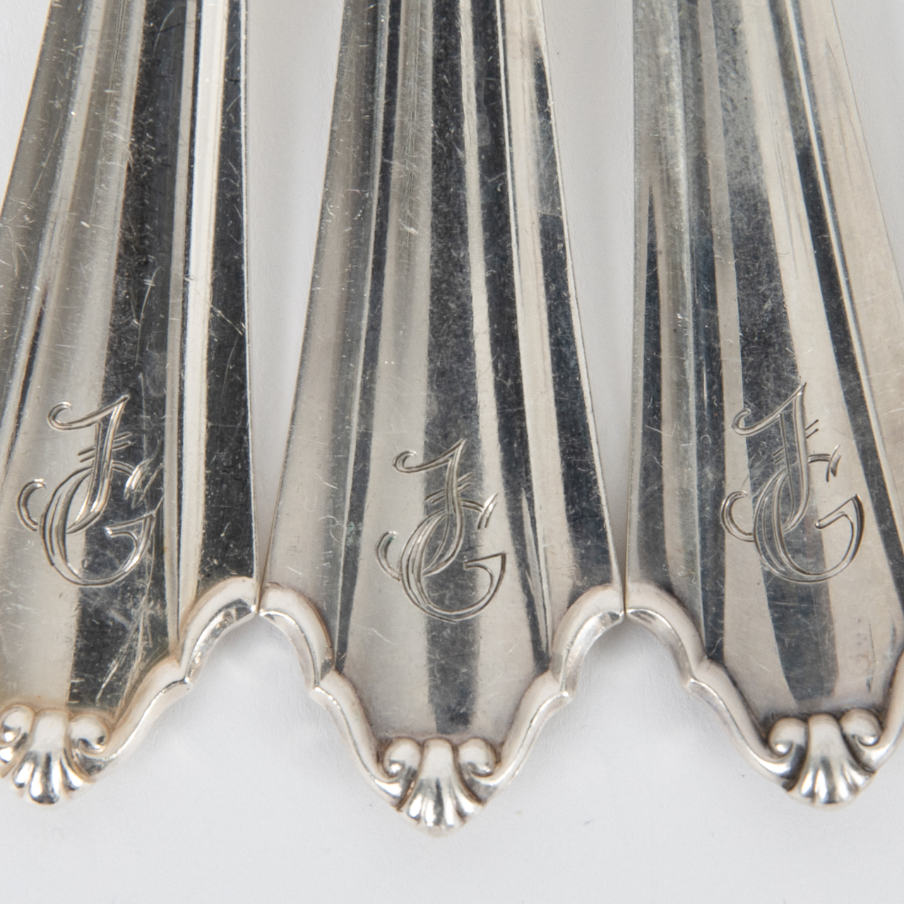 800/- Silber; Gesamtgewicht: ca. 5 kg; 159-teiliges Konvolut mit diversen Monogrammen („G“, „JR“, „JG“, „JH“, „FR“, „JS“) am Stilende, bestehend aus: 15 Tafelmesser (L: ca. 25,5 cm), 15 Menümesser (L: ca. 21,4 cm), Kompottlöffel (L: ca. 8,8 cm), Bouillonlöffel (L: ca. 13,5 cm), Menülöffel (L: ca. 18,5 cm), Tortenheber (L: ca. 21,8 cm), Paar Zuckerzangen (L: ca. 10,6 cm), Paar Vorlegegabeln (L: ca. 19 cm), Gebäckheber (L: ca. 17 cm), Tortenmesser (L: ca. 27,3 cm), 3 Auffülllöffel (L: ca. 21,4 cm), großer Vorlegelöffel (L: ca. 27,8 cm), 3 Schöpfkellen (L: ca. 18,5 cm), 6 Eislöffel (L: ca. 13,3 cm), 10 Kaffeelöffel (L: ca. 13,7 cm), 17 Teelöffel (L: ca. 12,4 cm), 16 Kuchengabeln (L: ca. 14,5 cm), 15 Suppentassenlöffel (L: ca. 15,4 cm), 6 Beilagemesser (L: ca. 17,5 cm), 4 Fischmesser (L: ca. 22 cm), 4 Fischgabeln (L: ca. 18 cm), 18 Tafelgabeln (L: ca. 21,4 cm), 16 Tafellöffel (L: ca. 21,7 cm); einige Besteckteile mit rückseitigen Gravuren; alle Teile rückseitig gestempelt mit Halbmond und Krone, Herstellerstempel von Wilkens & Söhne oder BSF, Feingehaltsstempel und teilweise mit Juwelierstempel, u. a. Watty; altersbedingte Gebrauchsspuren, minimale Verformungen und Oxidationsrückstände, 5 Messer müssen neu gekittet werden.