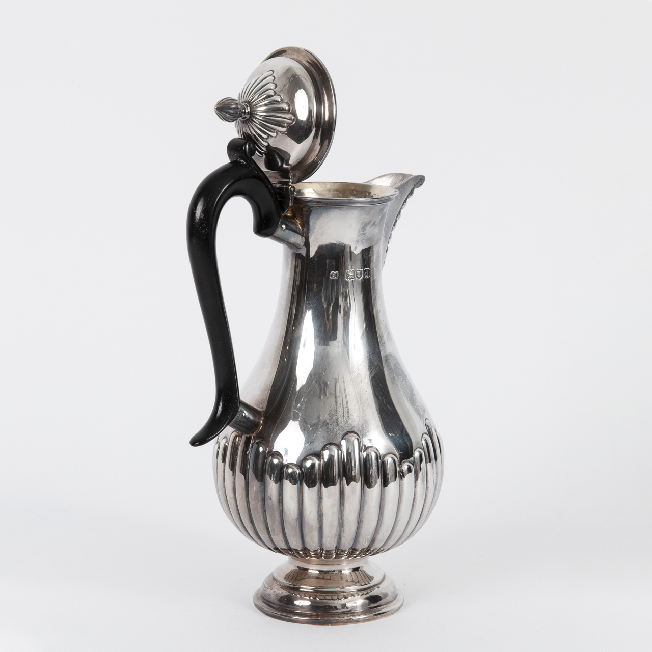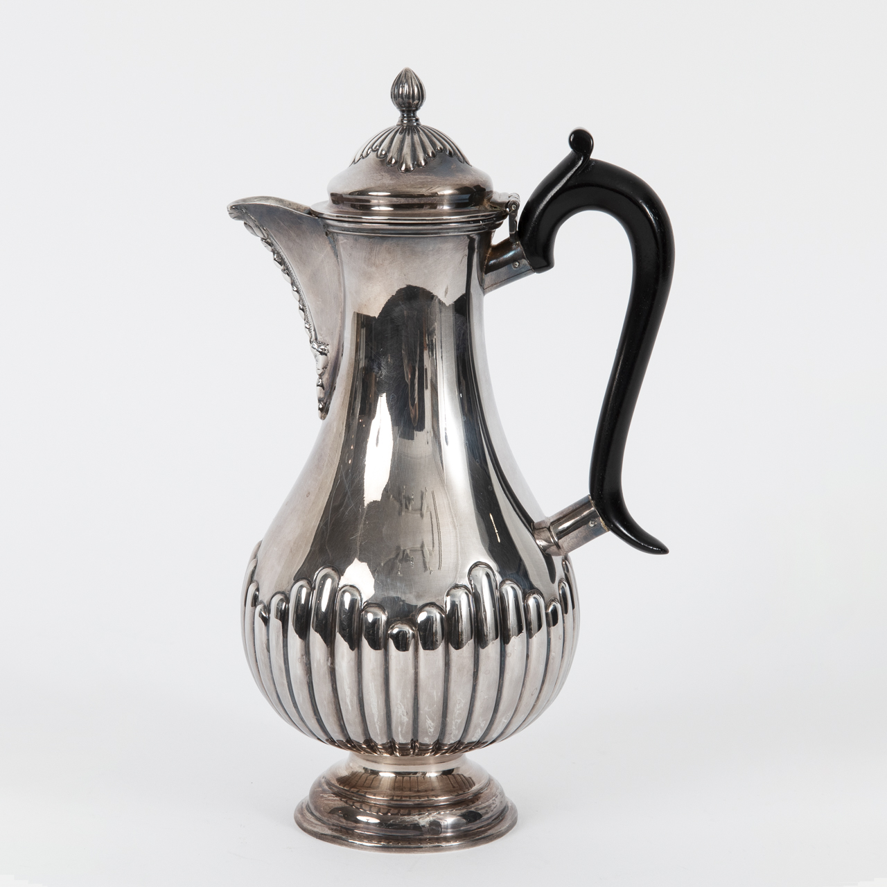 Sterling silver; total weight: approx. 360 g; silver coffee pot with baluster-shaped body and encircling reed decoration to the lower section, on a domed double-stepped foot; high-set ear-shaped handle made of ebonised wood; hinged domed lid with ornamental decoration and finial-shaped handle; pointed spout with ornamental and floral decoration; age-related signs of wear, fine scratches to the body measuring approx. 7 cm; tarnish-protected; stamped at the side of the neck with lion passant, town mark, maker’s mark and date letter; height: approx. 23.1 cm.
