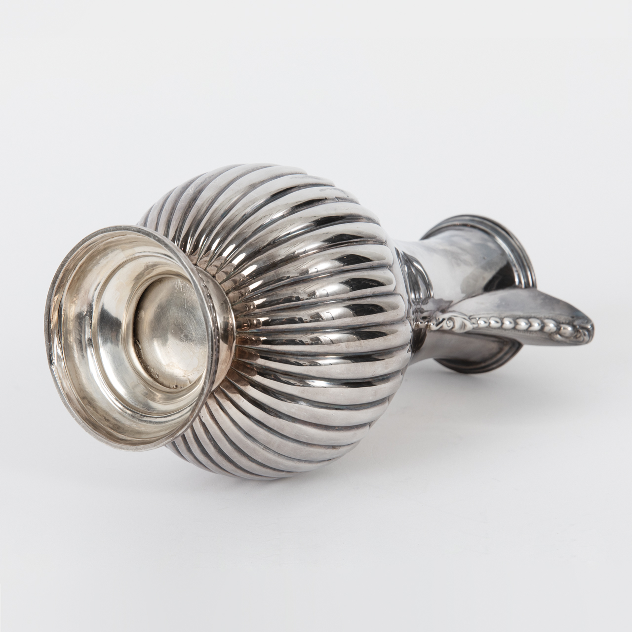 Sterling Silber; Gesamtgewicht: ca. 360 g; Silberkanne mit balusterförmigem Korpus mit umlaufendem Stäbchendekor auf der unteren Seite, auf gewölbtem, zweifach getrepptem Stand; hoch angesetzter Ohrenhenkel aus ebonisiertem Holz; abklappbarer Haubendeckel mit Ornamentaldekor und zapfenförmiger Handhabe; spitzer Schnabelausguss mit Ornamental- und Floradekor; altersbedingte Gebrauchsspuren, feine Schrammen am Korpus über ca. 7 cm; anlaufgeschützt; seitlich am Hals gestempelt mit Lion Passant, Stadtmarke, Herstellerpunze und Jahresbuchstaben; Höhe: ca. 23,1 cm.