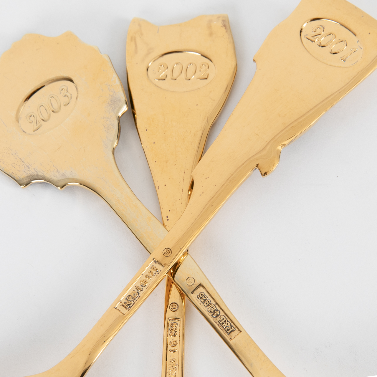 925/- Sterling Silber, vergoldet; Gesamtgewicht: ca. 348 g; Löffel mit runder Laffe, schmalem Steg und individuellen Dekoren aus polychromer Emaille konturiert; Konvolut bestehend aus den Jahreslöffeln 2001 mit Reiher-Dekor, 2002 mit Floraldekor, 2003 mit Zitronenbaumdekor, 2004 mit stilisiertem Vogel auf Wasser vor Schilf und 2005 mit Federdekor über die gesamte Handhabe; alle Löffel rückseitig gestempelt mit Halbmond und Krone, Herstellerpunze, Feingehaltsstempel und Nummerierung; am Stilende das jeweilige Jahr gestempelt; Länge: von ca. 17,4 bis ca. 17,7 cm.