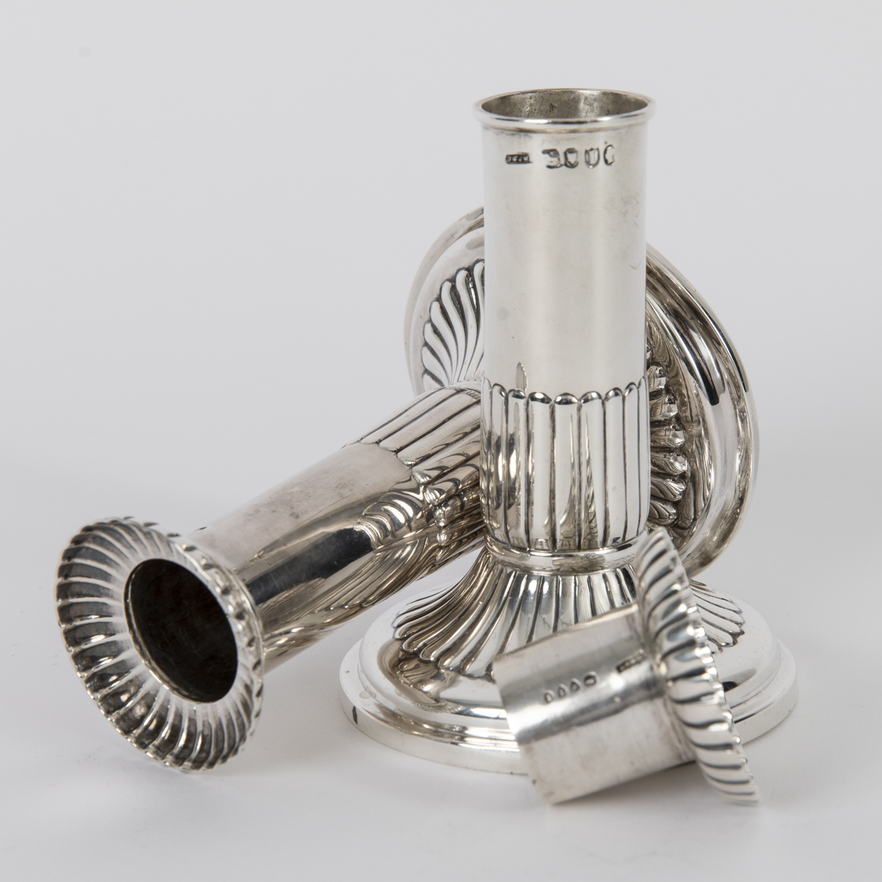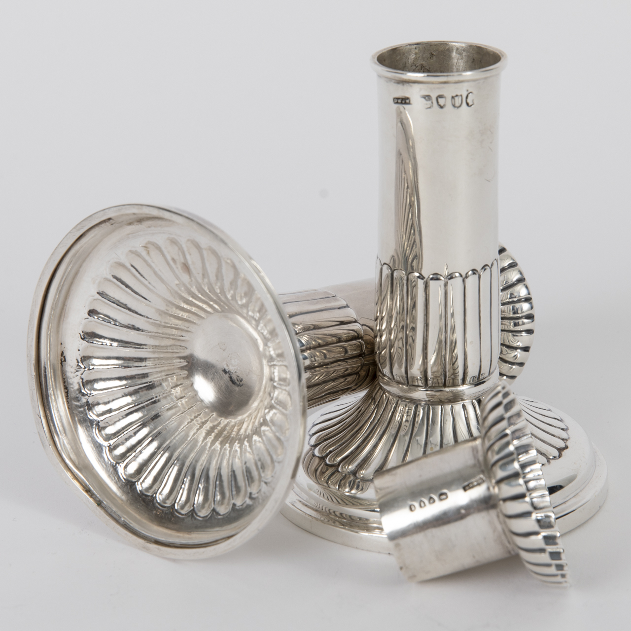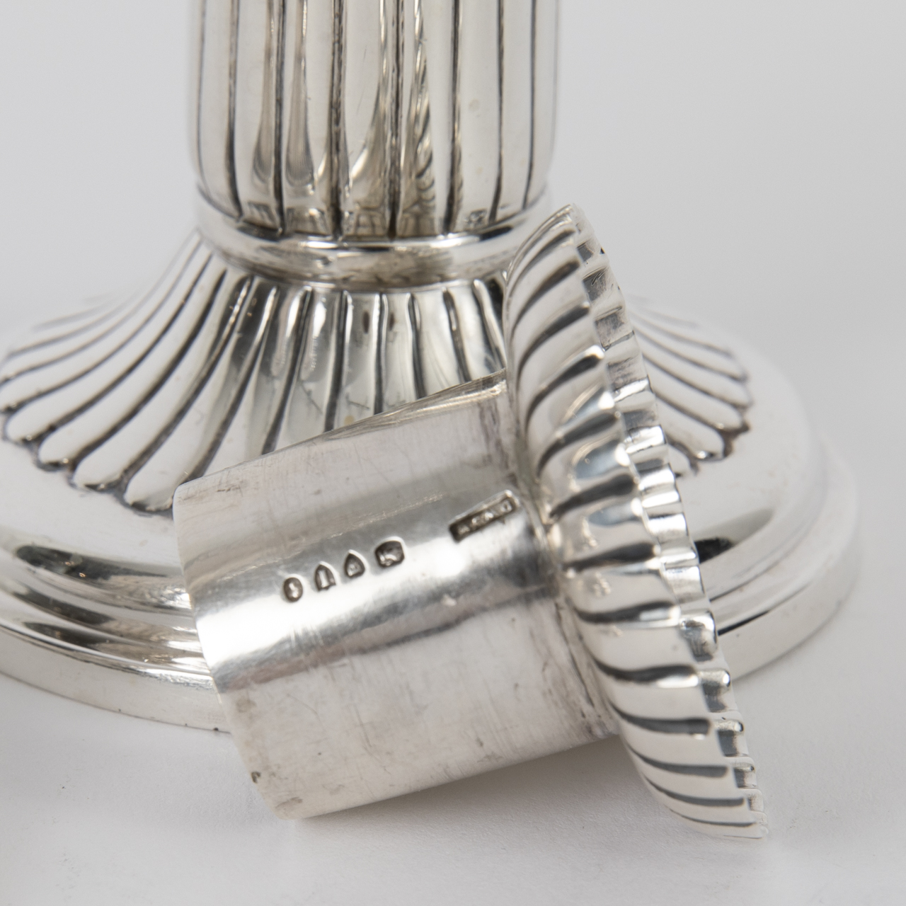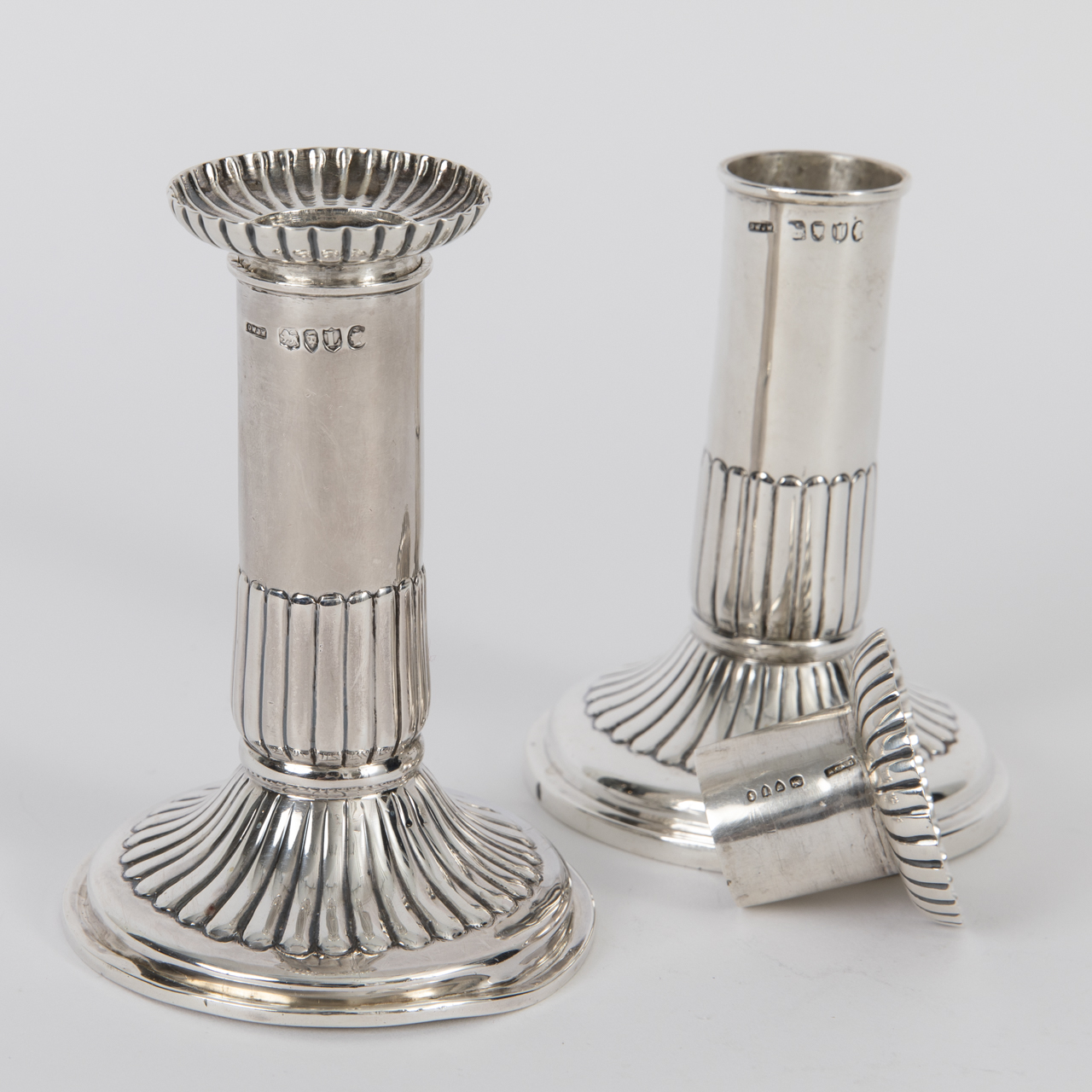 Sterling Silber; Gesamtgewicht: ca. 246 g; Paar Standleuchter mit umlaufender senkrechter Rillierung, zylindrischem Schaft, ringförmigem, schmalem Nodus auf rundem, getrepptem Standfuß mit abnehmbarer geschwungener Tülle; am Schaft gestempelt mit Lion Passant, Stadtmarke, Jahresbuchstaben, Meistermarke sowie Steuermarke; altersbedingte Gebrauchsspuren und Materialverformungen; Höhe: ca. 10,8 cm und 11,1 cm.