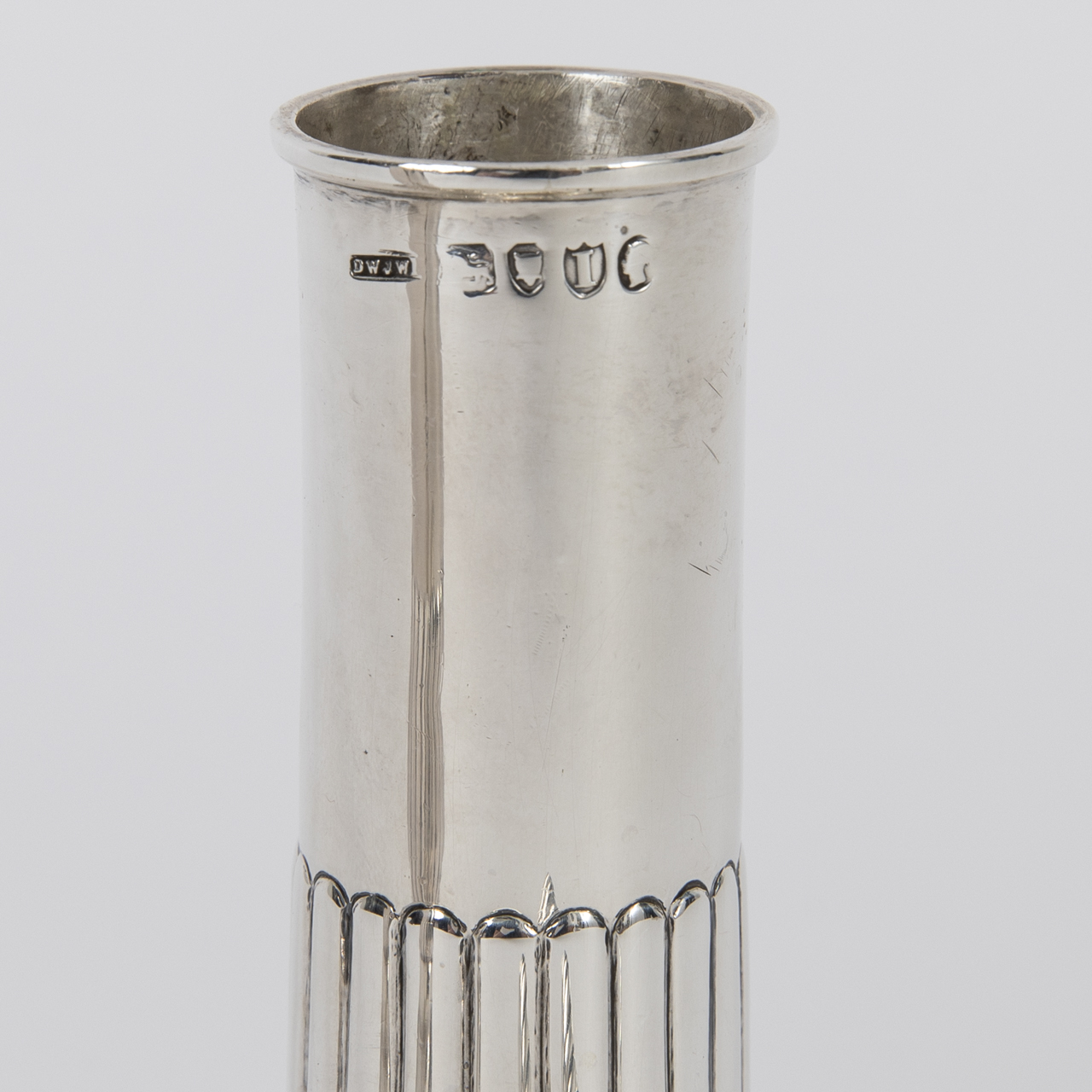 Sterling silver; total weight: ca. 246 g; pair of candlesticks with circumferential vertical fluting, cylindrical shaft, narrow annular knop on circular stepped foot with removable curved nozzle; shaft stamped with lion passant, city mark, date letters, maker’s mark and duty mark; age-related signs of wear and material deformations; height: ca. 10.8 cm and 11.1 cm.