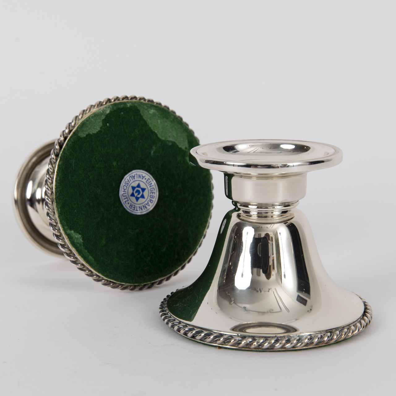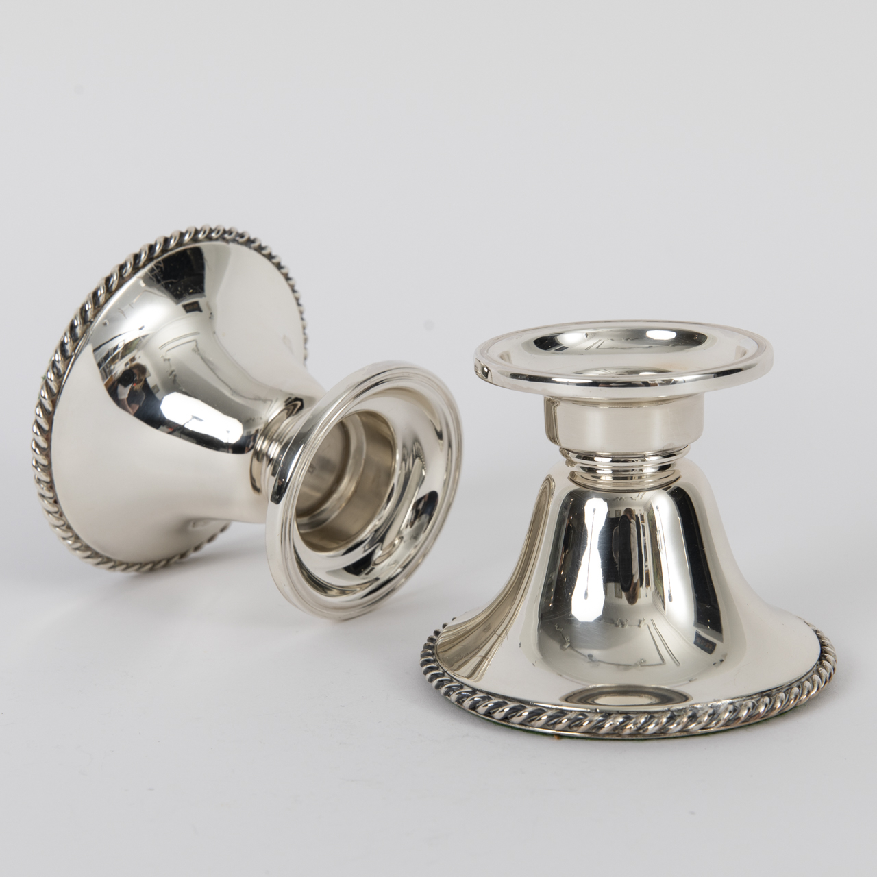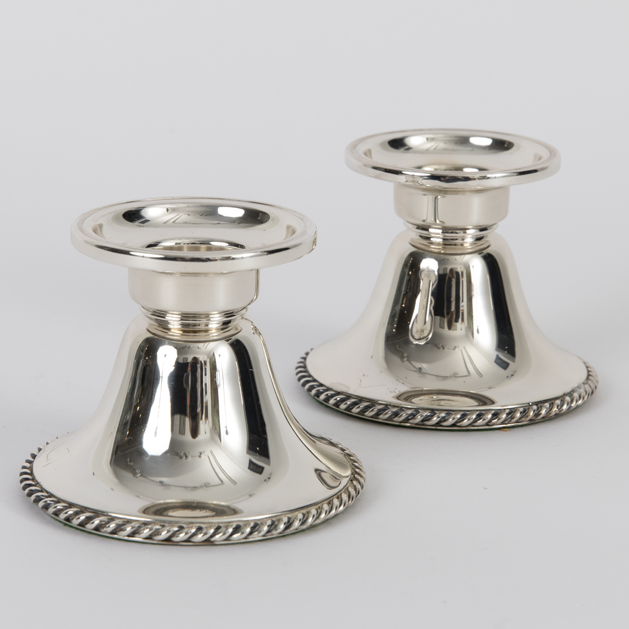 835/-Silber (gefüllt); Gesamtgewicht: ca. 535 g; Paar Leuchter mit ausladender, profilierter Tülle, eingezogenem Hals und breitem, glockenförmigem Stand mit umlaufendem Kordelrand; mit Halbmond und Krone, Feingehaltsstempel und Herstellermarke versehen; beide mit altersbedingten Gebrauchsspuren, ein Leuchter mit schmaler Linie über ca. 3 cm Länge; Höhe: ca. 7,3 cm.