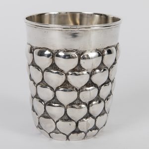 835 silver; weight: approx. 210 g; beaker with slightly conical wall and chased small hearts; remains of gilding inside; underside stamped with crescent and crown as well as fineness mark; age-related signs of wear; height: approx. 9.5 cm.