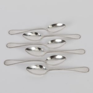 800/- silver; total weight: approx. 100 g; six teaspoons with continuous beaded edge on handle and bowl; reverse of handle stamped with crescent moon and crown, maker’s mark, master’s mark and fineness mark; age-related signs of wear; length: approx. 14.6 cm.