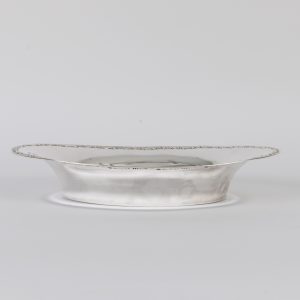 800/- silver; weight: approx. 310 g; silver dish in oval form with wide, strongly curved wall and surrounding embossed floral and ornamental decoration on the rim; underside stamped with crescent moon and crown, fineness mark and worn maker’s mark; age-related signs of wear; dimensions: approx. 6.2 × 32.5 × 20 cm.