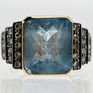 750/- yellow gold and silver; total weight: approx. 7.5 g; high stepped ring head; centrally set rectangular faceted aquamarine of light blue colour variety with visible jardin; dimensions: approx. 13 x 11 x 7 mm; sides of the setting with four-tiered, tapering lines, each side set with 5, 4, 3 and 2 diamonds; both shoulders adorned with two stylised diamond-set leaves; minor signs of wear and a small chip on the aquamarine as well as a loss on the setting edge of approx. 1.8 mm; dimensions of ring head: approx. 13.6 x 20.8 mm; height: approx. 7.9 mm; ring size: 53.5.