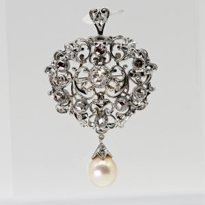 750/- white gold; total weight: approx. 16.4 g; stylised raised triangular form with openwork ornamental décor and applied settings; central rose-cut diamond, approx. 0.6 ct; colour: H; clarity: VVSI-VSI; 107 diamonds totalling approx. 2.9 ct, partly old-cut and melee stones; colour in the medium to lower range; clarity in the upper to medium range; some stones probably foil-backed; suspended at the lower end, a champagne-coloured Akoya pearl with silvery-grey lustre; pin fitting and suspension loop on reverse; minor facet edge nicks; total length: approx. 47 mm; width: approx. 35.1 mm.