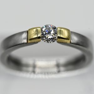 585/- yellow gold; total weight: approx. 8 g; flattened spherical form with concave centre, polished inner wall and bezel setting holding a round faceted citrine; diameter: approx. 10.5 mm; high outer rim with satin-finished surface décor divided by eight polished narrow ribs; arched shoulder and plain shank; total diameter of ring head: approx. 18.3 mm; height: approx. 10.4 mm; ring size: 56.