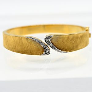 585/- yellow and white gold; total weight: approx. 45.5 g; oval shape with tapered design; open centre with rounded middle ending and applied sweeping white gold band, each side set with six brilliant-cut diamonds, totalling approx. 0.4 ct; colour and clarity in the upper range; concealed box clasp with side safety catch; satin-finished surface, polished sides and interior; width at centre: approx. 15.7 mm; width at underside: approx. 7.9 mm; inner dimensions: approx. 6.3 x 5.4 mm.