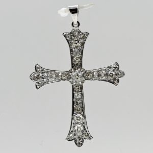 585/- white gold (acid-tested); total weight: approx. 6.4 g; religious, classic cross shape with trefoil-ended arms; entirely pavé-set with old-cut and single-cut diamonds; central raised coronet setting with one old-cut diamond; all diamonds totalling approx. 1.75 ct; colour: G-J; clarity: SI-piqué; dimensions of cross: approx. 42.6 x 33.9 mm; length incl. triangular bail: approx. 50.4 mm.