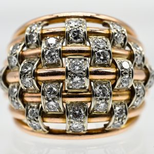 585/- rose and white gold; total weight: approx. 11 g; arched fan shape crafted from seven rings; connected by 19 white gold bars in stylised braided design; set with 38 brilliant-cut diamonds, totalling approx. 1.4 ct; colour and clarity in the upper range; dimensions of ring head: approx. 19.4 mm; height: approx. 6.5 mm; ring size: 52.