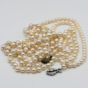 Clasps made of various metal alloys, some set with diamond imitations (moissanite); pearls of differing quality, size and length; partly defective and knotted; length: from approx. 40 cm to approx. 58 cm.