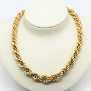 750/- yellow gold, stamped 18 k; total weight: approx. 64.8 g; double rope design with relief surface pattern and tapered sides; concealed box clasp with side safety latch; diameter: from approx. 8.1 mm to approx. 12.5 mm at the centre; total length: approx. 43 cm.