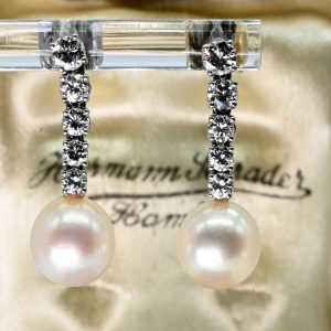 750/- white gold; total weight: ca. 4.2 g; 585/- yellow gold: 1 screw fitting; total weight: ca. 0.28 g; 5 brilliant-cut diamonds each, set in individual articulated prong settings in graduated sequence; total ca. 0.8 ct; colour: G-F; clarity: VSI; suspended champagne-coloured pearl with silvery-grey lustre, probably orient; dimensions of pearls: ca. 9.1 x 8.5 mm; overall length of earrings: ca. 24.3 mm.