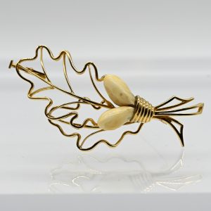 750/- yellow gold; total weight: ca. 12.5 g; 2 overlapping stylised oak leaves made of bent square wire; at the crossing point 2 mounted teeth; sliding hook clasp with white gold pin; length of brooch: ca. 61.5 mm; width: ca. 27.3 mm.