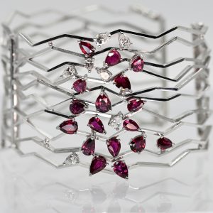 585/- white gold; total weight: ca. 55.1 g; broad, slightly oval, hinged form composed of 10 individual, adjoining, serrated, square wires with partly hatched and polished surface structure; front with irregularly arranged prong settings, set with 17 pear-cut rubies, total ca. 5.5 ct; high-quality red-violet varieties with very slight, differing nuances of colour and inclusions; contoured by 7 pear-cut diamonds, total ca. 0.9 ct; colour: E-G; clarity: VVSI-VSI; concealed box clasp with side safety eights; width of bangle: ca. 42.2 mm; inner dimensions: ca. 5.5 x 5.2 mm; one ruby with small chip under the prong.
