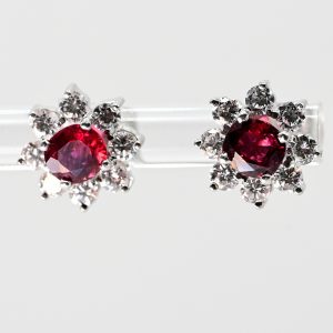 750/- white gold; total weight: ca. 3.3 g; stylised rosette form composed of individual, partly stepped prong settings; centrally set high-quality rubies, total ca. 1 ct; intense pigeon blood-red variety; each surrounded by 8 brilliant-cut diamonds, total ca. 0.8 ct; colour: E-F; clarity: VVSI-VSI; diameter: ca. 9.7 mm; height: ca. 4.9 mm.