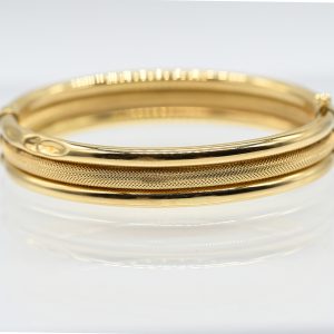 750/- yellow gold; total weight: ca. 17.8 g (not filled); oval; steel spring as opening mechanism; triple profiled; adjoining hoops; central hoop circumferentially with fine lozenge chasing, side hoops each with polished surface; concealed clasp with side safety eight; bracelet width: ca. 12 mm; thickness: ca. 3.8 mm; inner dimensions of bangle: ca. 5.8 x 5.1 cm; marked signs of wear on the outer hoops.