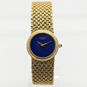 750/- yellow gold; total weight: 54.9 g; round profiled case with satin-finished narrow bezel; lapis lazuli dial with golden arrow-shaped hands; wide bracelet in stylised braided pattern of very fine cord wire; lateral design; safety folding clasp; case diameter: ca. 24.5 mm; bracelet width at lug: ca. 17.5 mm and at clasp: 14.3 mm; overall length: ca. 17 cm; no guarantee on movement and function.