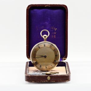 750/- yellow gold and doublé; total weight: approx. 117.5 g; key-wound movement; round case with glazed display side; gold-coloured dial with polished ring, black Roman numerals and blued hands; engine-turned central field and narrow outer rim; back hinged with polished cover and faint oval cartouche; dust cover made of doublé; diameter: approx. 56.1 mm; age-related signs of wear; no guarantee on movement or function.