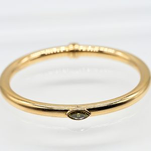 750/- yellow gold; total weight: approx. 31.8 g; round, oval hoop form; opening in the middle; concealed clasp, with a horizontally mounted bezel setting on one side in navette shape with a faceted olivine peridot; on the lower opposite side a spring catch made of steel; dimensions of the bezel setting: approx. 5.8 x 11.6 mm; central total height: approx. 7.1 mm; hoop diameter: approx. 5.9 mm; inner hoop diameter: approx. 6.2 x 5.3 mm.