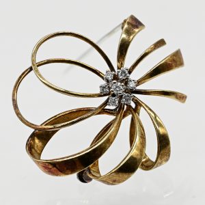 585/- yellow and white gold; total weight: approx. 8.2 g; five-fold bows with four-fold ribbons; centrally 7 raised claw settings, each set with a brilliant-cut diamond, total approx. 0.2 ct; colour: G-I, clarity: VSI and 1 × piqué 1; safety ball clasp; dimensions: approx. 38 × 37.2 mm, height: approx. 8.1 mm. Stamped: FE.