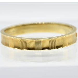 585/- yellow gold; total weight: approx. 28.7 g (partly hollow); oval, hinged band form with concave inner side; all around divided into individual rectangular segments with finely hatched horizontal and vertical décor; concealed box clasp with side safety eight; inner diameter of the hoop: approx. 6 × 5.3 cm; width: approx. 10 mm; various light signs of wear.