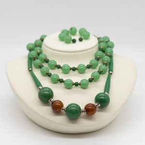 1) Necklace with two-tone green agate and partly gold-plated (doublé) side elements and ball clasp; bead diameters: approx. 11.8 mm and 5.8 mm; total length: approx. 67 cm; necklace needs to be restrung; replacement beads included. 2) Necklace of green and brown Bakelite in spherical and elongated funnel shape, strung in a graduated side sequence; separated by silver-coloured metal elements; bead diameters: approx. 19.3 mm and 15.2 mm; total length: approx. 42 cm; clasp incomplete and defective.