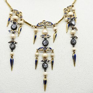 585/- yellow gold and silver setting edges; total weight: approx. 14 g; antique centrepiece with linear triple pendant composed of several vertically linked pearls and diamond roses, with ornamental and lancet-shaped elements, partly outlined in blue enamel; width of the necklace centre: approx. 7.5 cm; length of individual pendants: 2 x approx. 5.5 cm and 1 x approx. 6 cm; pearls and enamel with age-related wear and surface damage; extension chain: fine anchor link pattern with box clasp and side safety latch; total necklace length: approx. 42 cm.