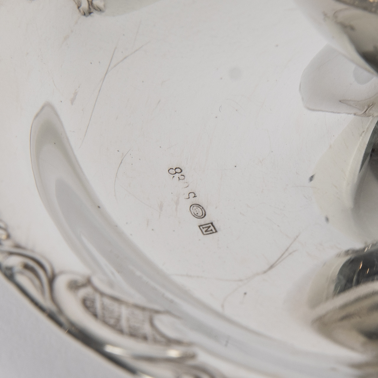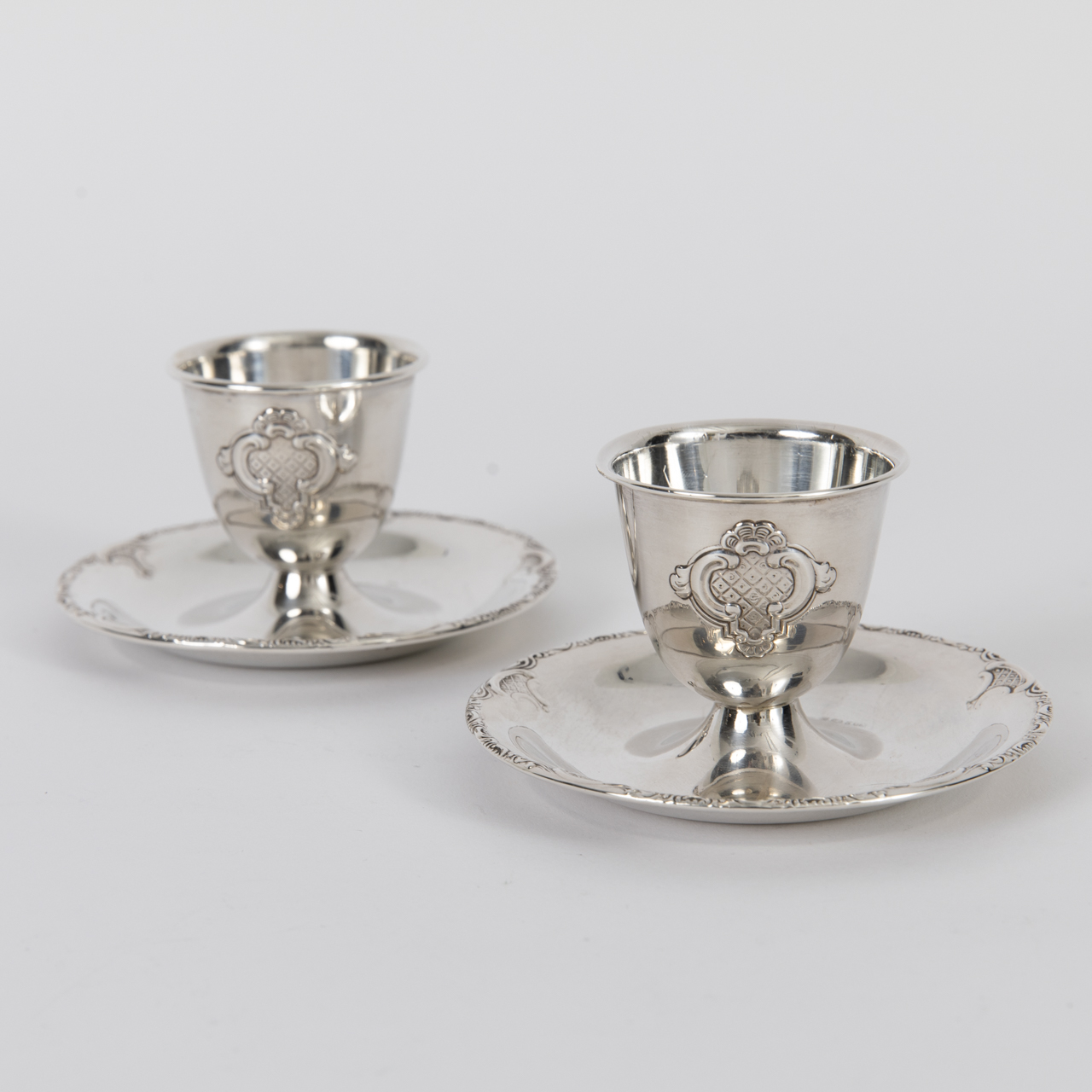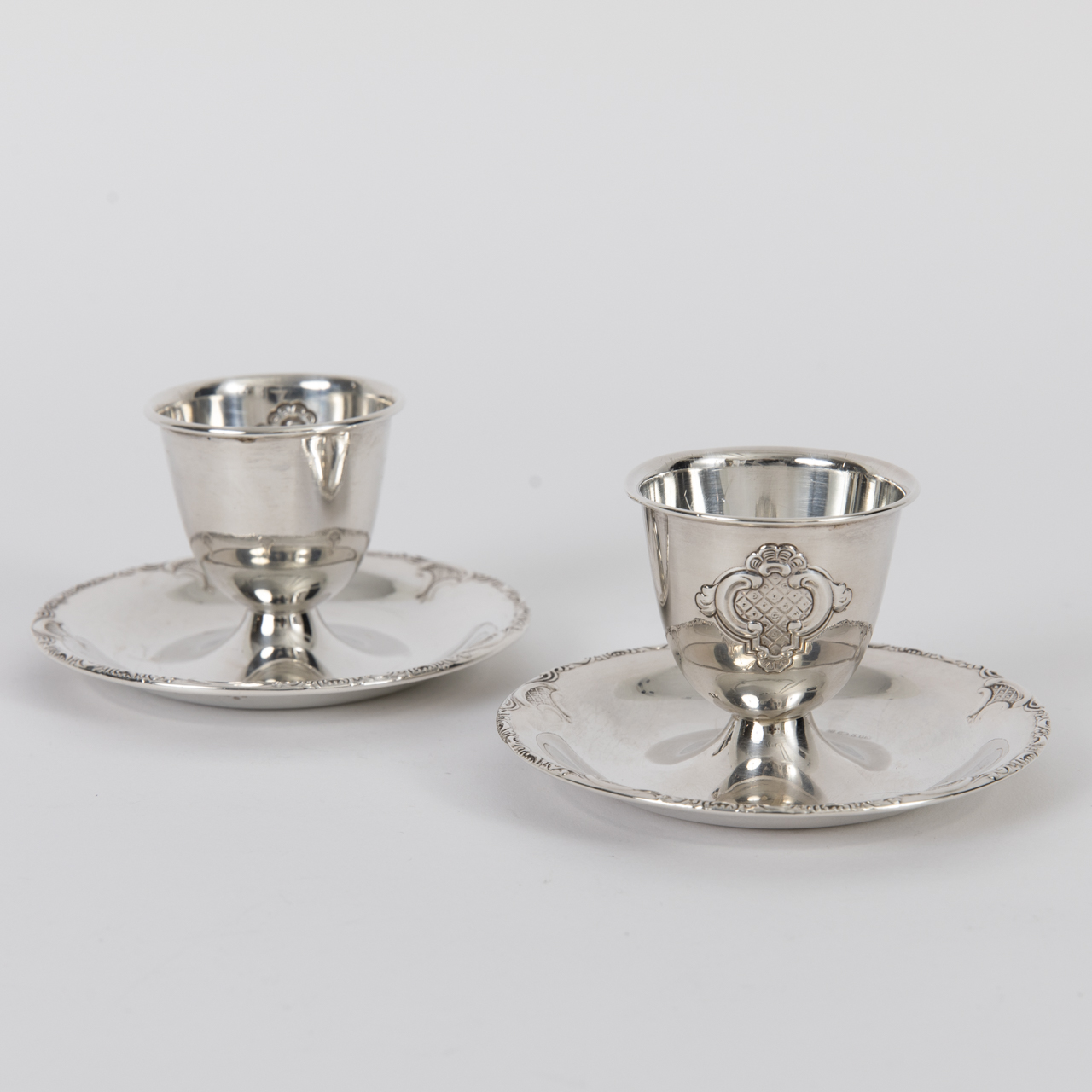830 silver; total weight: approx. 86 g; pair of egg cups with heraldic-style decoration on round, rising foot and bell-shaped bowl with convex wall and thickened rim, on solid saucer with curved rim and continuous ornamentally embossed border; saucer stamped with fineness mark and two unidentified hallmarks; several scratches as well as age-related signs of wear; height: approx. 5 cm.
