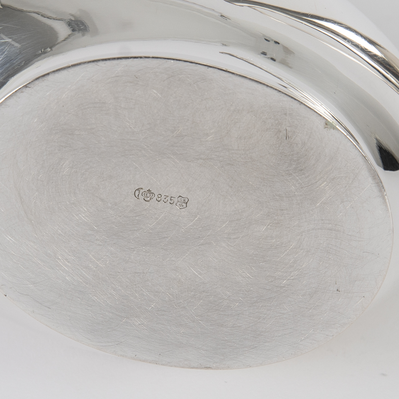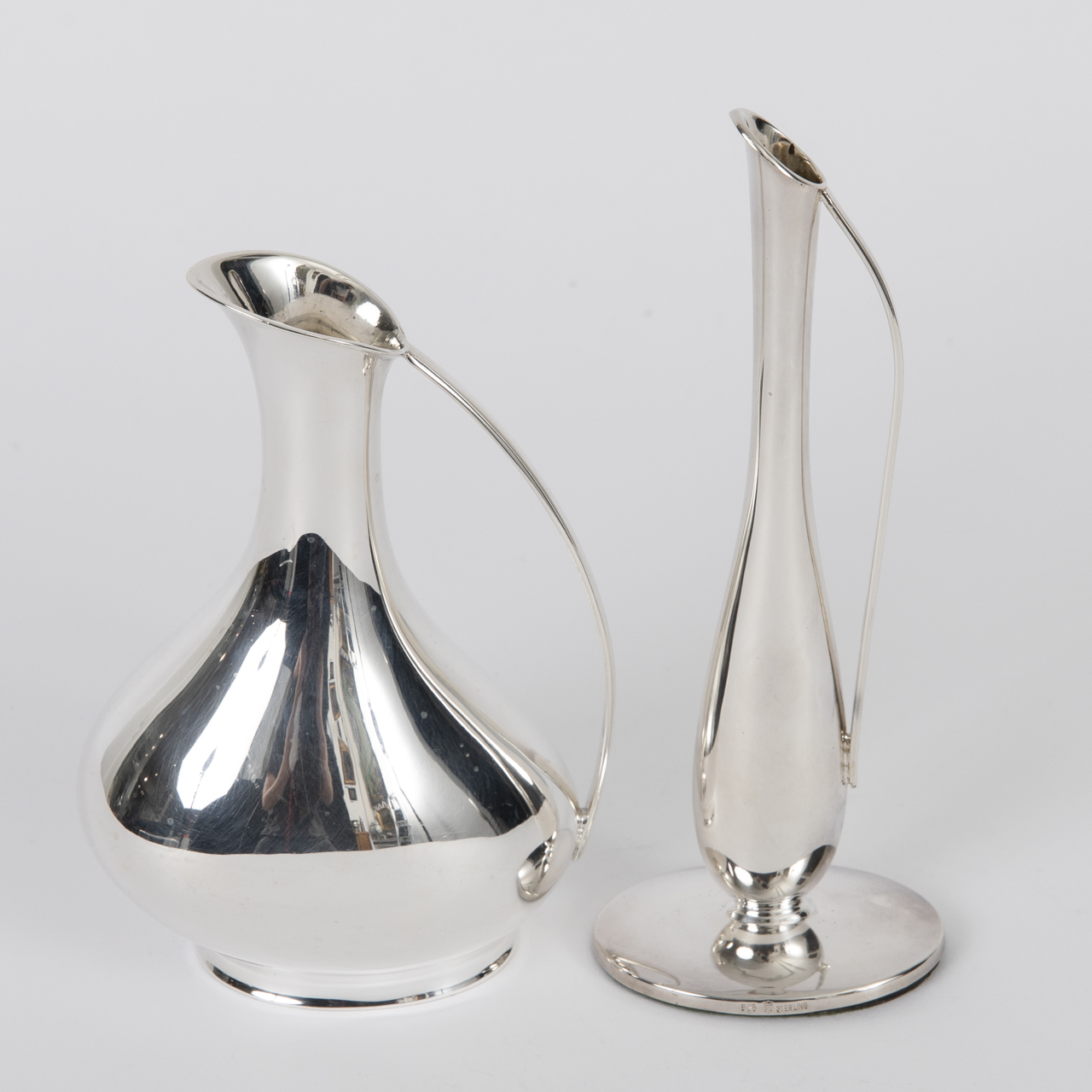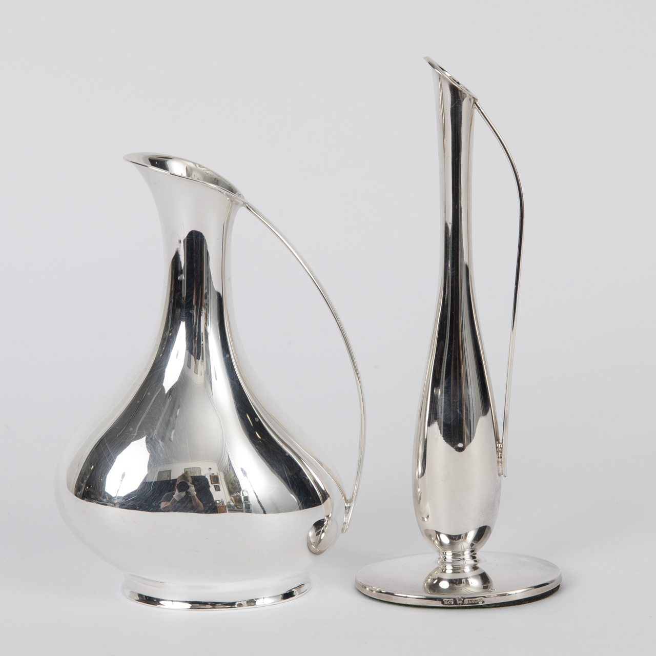 835/- and 925/- silver (one vase filled); total weight: ca. 286 g; 1) small vase with club-shaped body on oval base, side-mounted long narrow handle and obliquely set spout; side stamped with maker’s mark Hermann Bauer and fineness mark “925”; filler visible at side of base; height: ca. 17.6 cm. 2) small vase with pear-shaped body on stepped oval base with side-mounted narrow handle and oval spout; underside stamped with crescent moon and crown, maker’s mark Gottlieb Kurz and fineness mark “835”; interior of spout with localised discolouration; height: ca. 14.5 cm. Both pieces with age-related signs of wear.