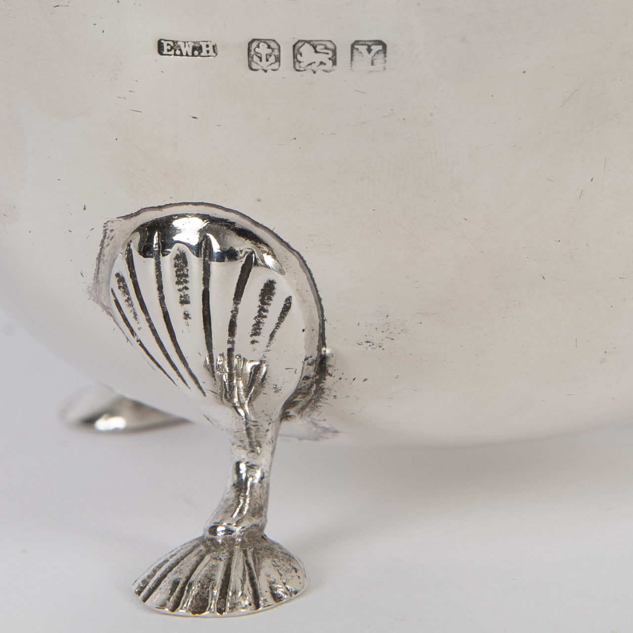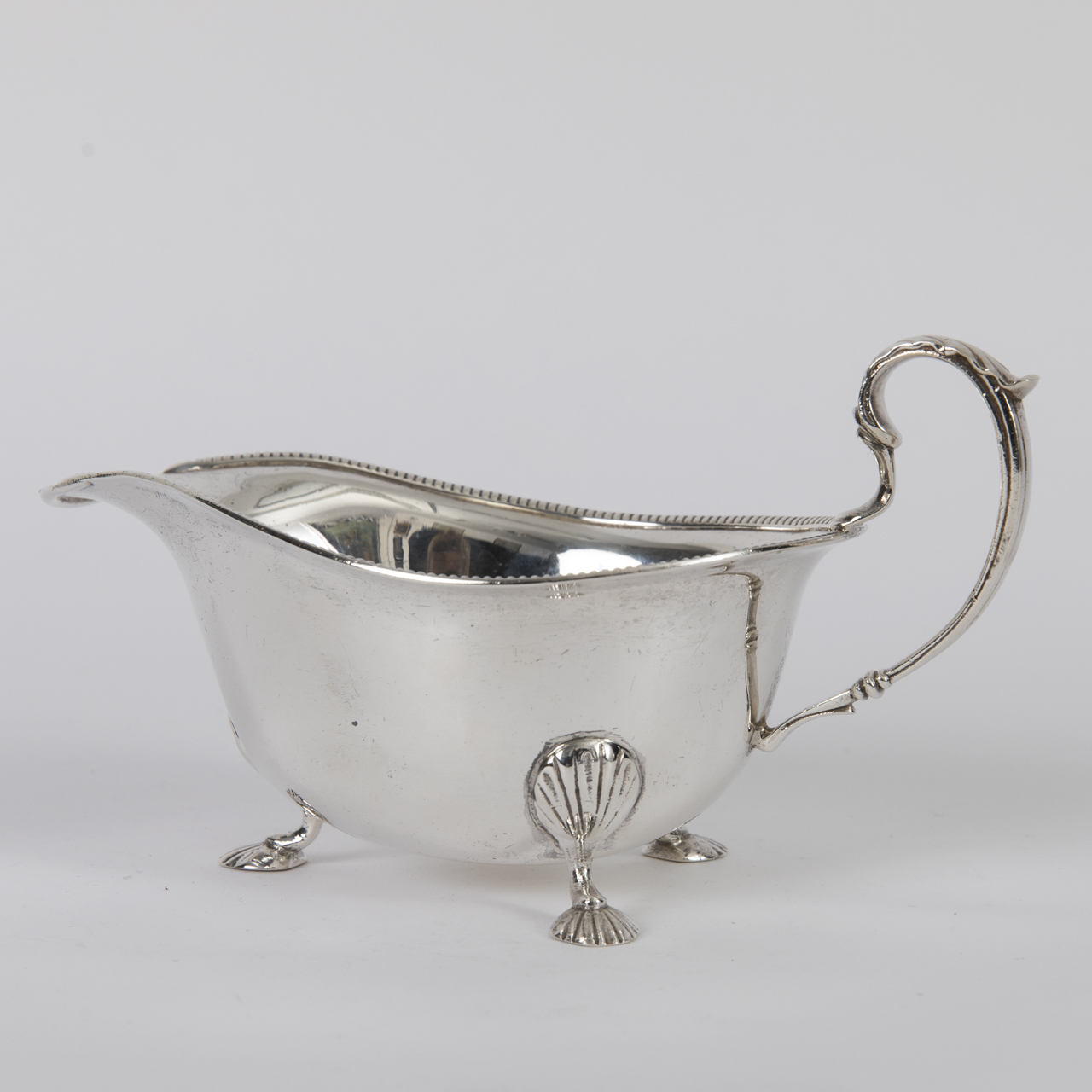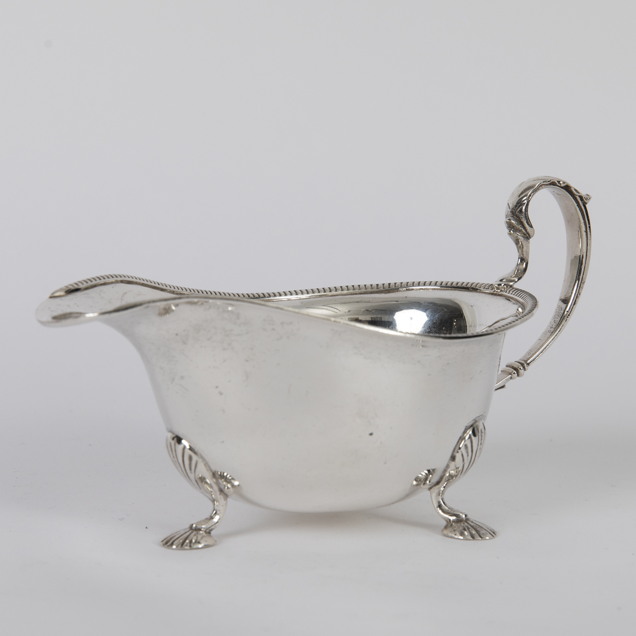Sterling Silber; Gewicht: ca. 135 g; silberne Saucière mit ovaler, konischer Wandung auf drei Krallenfüßen mit seitlich angesetztem, verziertem Volutenhenkel und umlaufender rillierter Borte am Rand; altersbedingte Gebrauchsspuren und Kratzer; am Rand gestempelt mit Lion Passant, Stadtmarke, Meistermarke sowie Jahresbuchstabe (Y); Maße: ca. 16,5 x 9 x 8,8 cm.