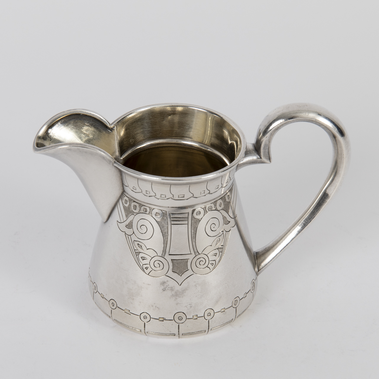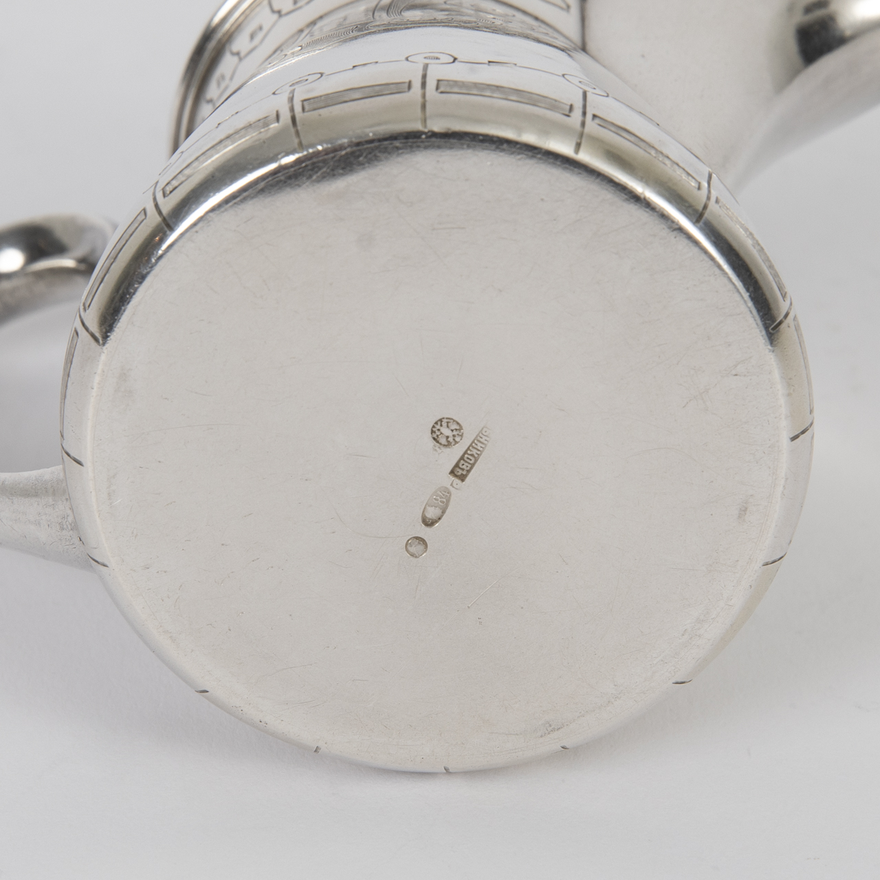 84 zolotnik; weight: approx. 103 g; silver cream jug with conical wall, flared lip rim, high-set wide spout and ear-shaped handle, encircled by fine chased ornamental décor; interior with remnants of gilding; spout and underside stamped with the mark of the Moscow district assay administration for 1908-1917, fineness mark, double-headed eagle mark and a partially struck maker’s mark, presumably Ivan Petrovich Khlebnikov; a few small dents and oxidation residues; height: approx. 7.8 cm.