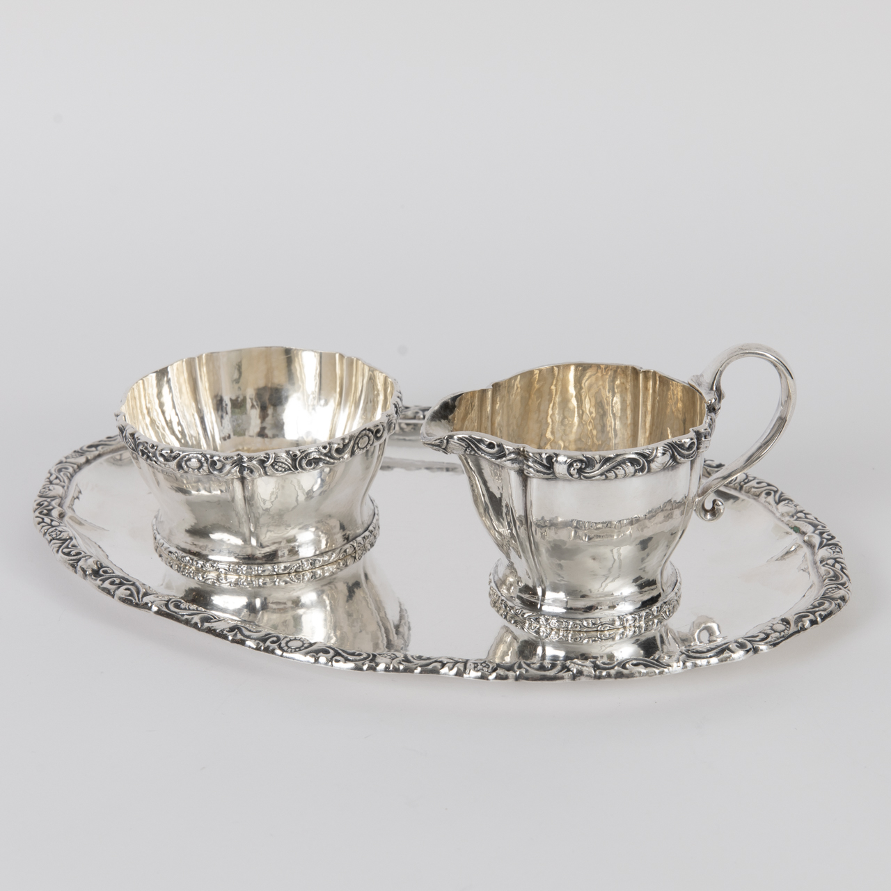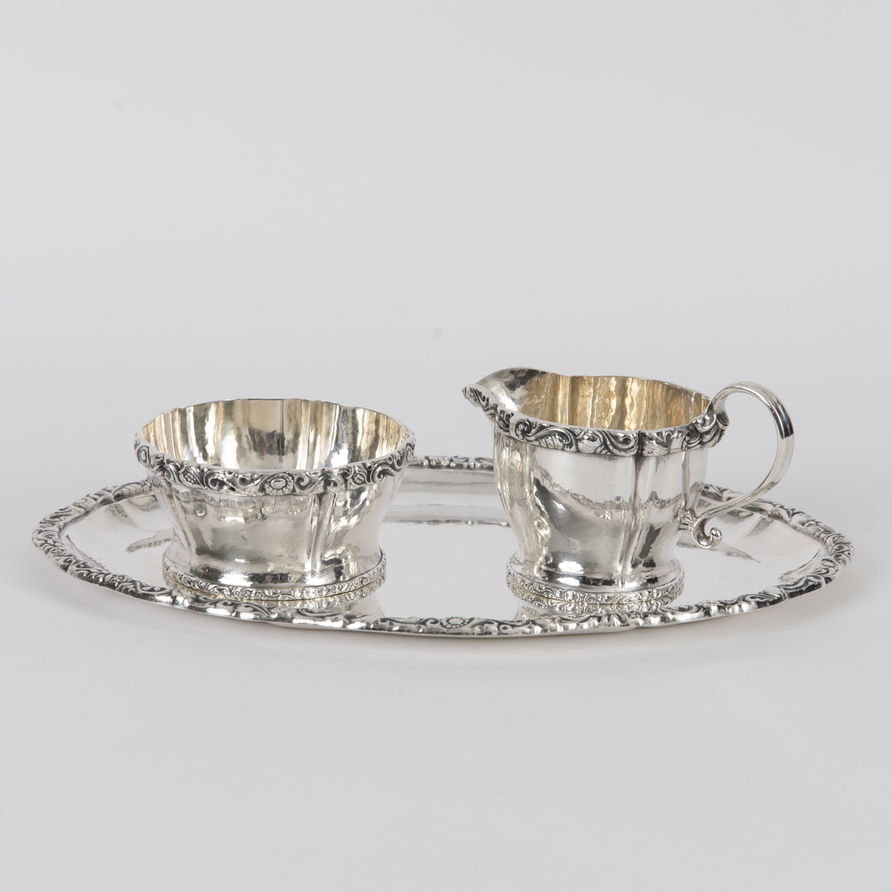 925/- Silber; Gesamtgewicht: ca. 728 g; dreiteiliges Set mit feinem Hammerschlagdekor und umlaufendem, aufgesetztem Floral- und Ornamentalfries auf der Schauseite, bestehend aus: 1) runde Zuckerschale mit fünfpassiger, leicht gebauchter Wandung auf profiliertem Stand; Höhe: ca. 5 cm; Durchmesser: ca. 10 cm. 2) Rahmgießer mit leicht gebauchtem vierpassigem Korpus, breitem Ausguss und hoch angesetztem Ohrenhenkel auf profiliertem Stand; Höhe: ca. 8,1 cm; eine punktuelle tiefere Kerbe. 3) kleines Anbiettablett mit ovalem Spiegel und achtpassiger, leicht ausgestellter Fahne; Maße: ca. 29,5 x 20 cm. Alle Teile mit Mikrokratzern und altersbedingten Gebrauchsspuren; alle Teile gestempelt mit Herstellermarke, Feingehaltsstempel sowie Nummerierung.