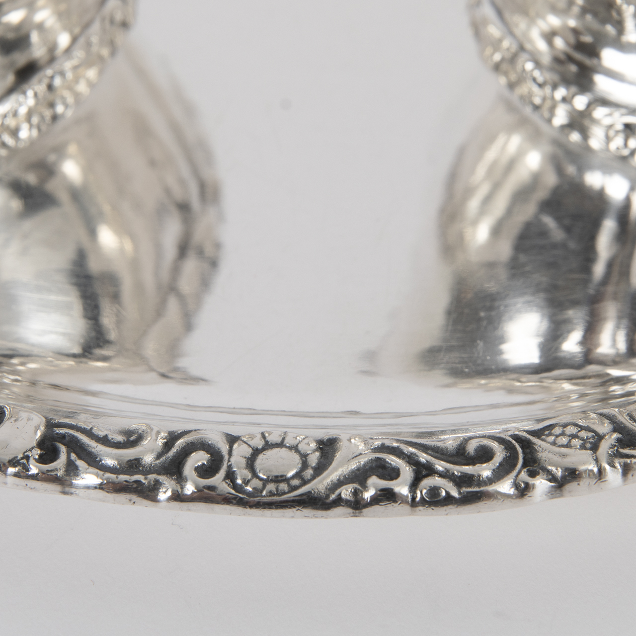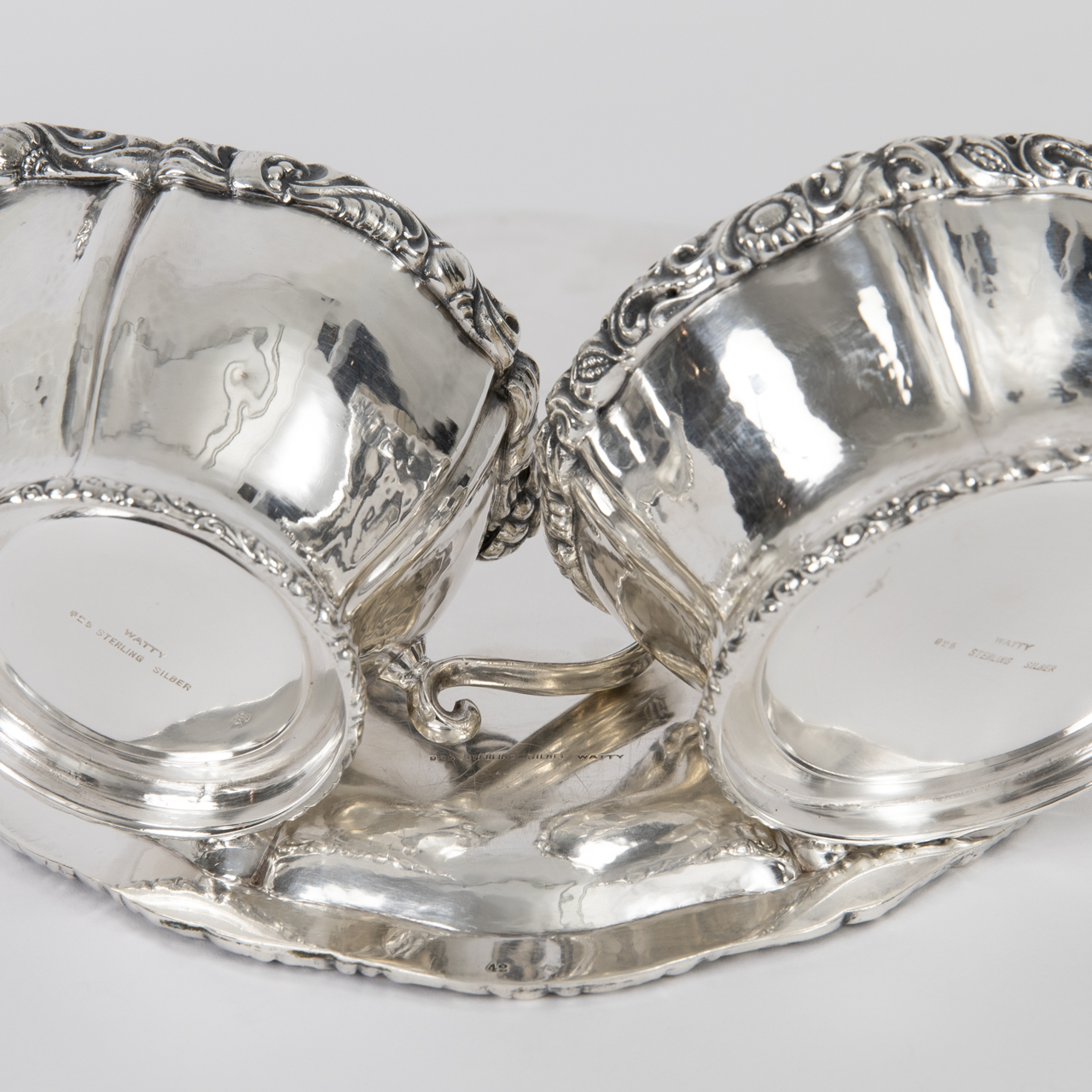 925 silver; total weight: approx. 728 g; three-piece set with fine hammered décor and surrounding applied floral and ornamental frieze on the front side, consisting of: 1) round sugar bowl with cinquefoil, slightly bulbous wall on profiled base; height: approx. 5 cm; diameter: approx. 10 cm. 2) cream jug with slightly bulbous quatrefoil body, wide spout and high-set ear-shaped handle on profiled base; height: approx. 8.1 cm; one punctual deeper nick. 3) small serving tray with oval mirror and octofoil, slightly flared rim; dimensions: approx. 29.5 x 20 cm. All parts with micro scratches and age-related signs of wear; all parts stamped with maker’s mark, fineness mark and numbering.