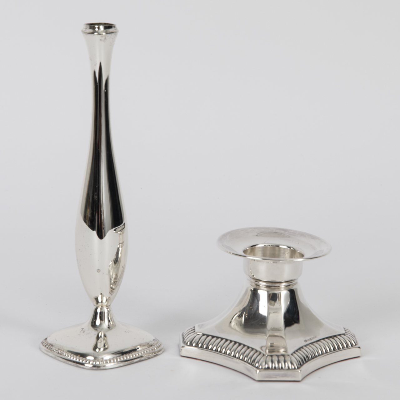 925/- Silber und Plated (beide gefüllt); Gesamtgewicht: ca. 357 g; 1) breiter Leuchter mit ausgestellter Tülle und eingezogenem Schaft auf konvexem vierpassigem Stand mit umlaufender Rillierung; seitlich gestempelt mit Halbmond und Krone, Herstellermarke und Feingehaltsstempel; Höhe: ca. 6,6 cm. 2) Vase mit keulenförmigem Korpus, eingezogenem Schaft auf quadratischem Stand mit umlaufendem Perlranddekor; mehrere oberflächliche Kratzer; Plated; Höhe: ca. 18,8 cm. Beide Teile mit altersbedingten Gebrauchsspuren.