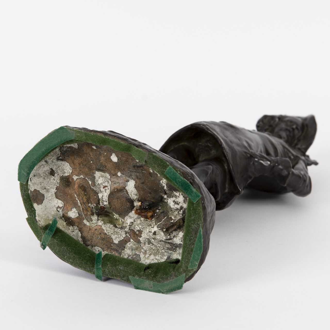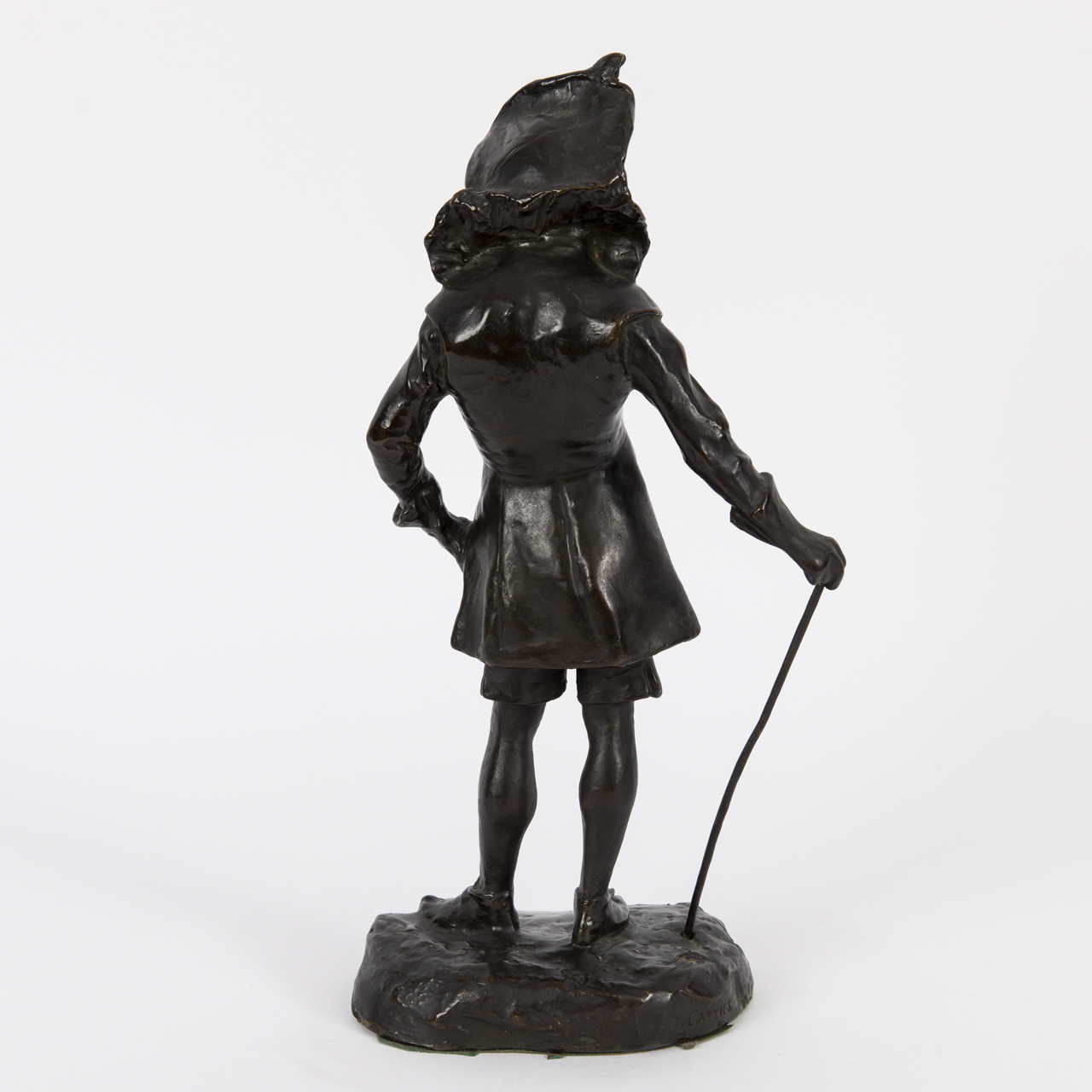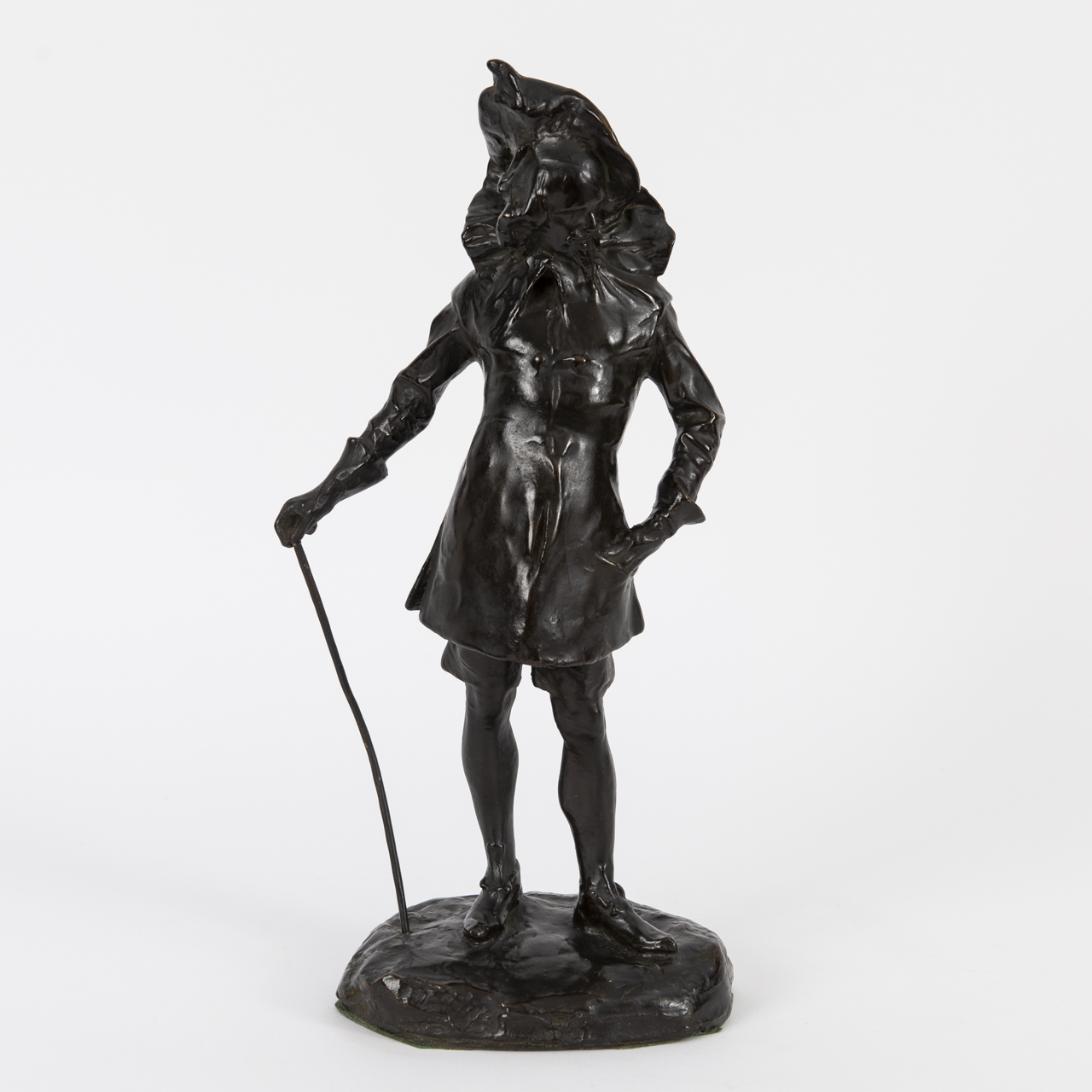 Bronze braun patiniert; „Le Gentilhomme dit le Callot“; figürliche Darstellung eines Herren mit Spitzbart in historischer oder allegorischer Kleidung, mit theatralischen Zügen, der Kopf ist leicht geneigt, der Blick nach unten gerichtet, eine Hand sich auf einem langen Stab abstützend; seitlich am Sockel signiert; Oberfläche leicht berieben, Stab leicht verbogen; Höhe: ca. 32,8 cm; Gewicht: ca. 2549 g.