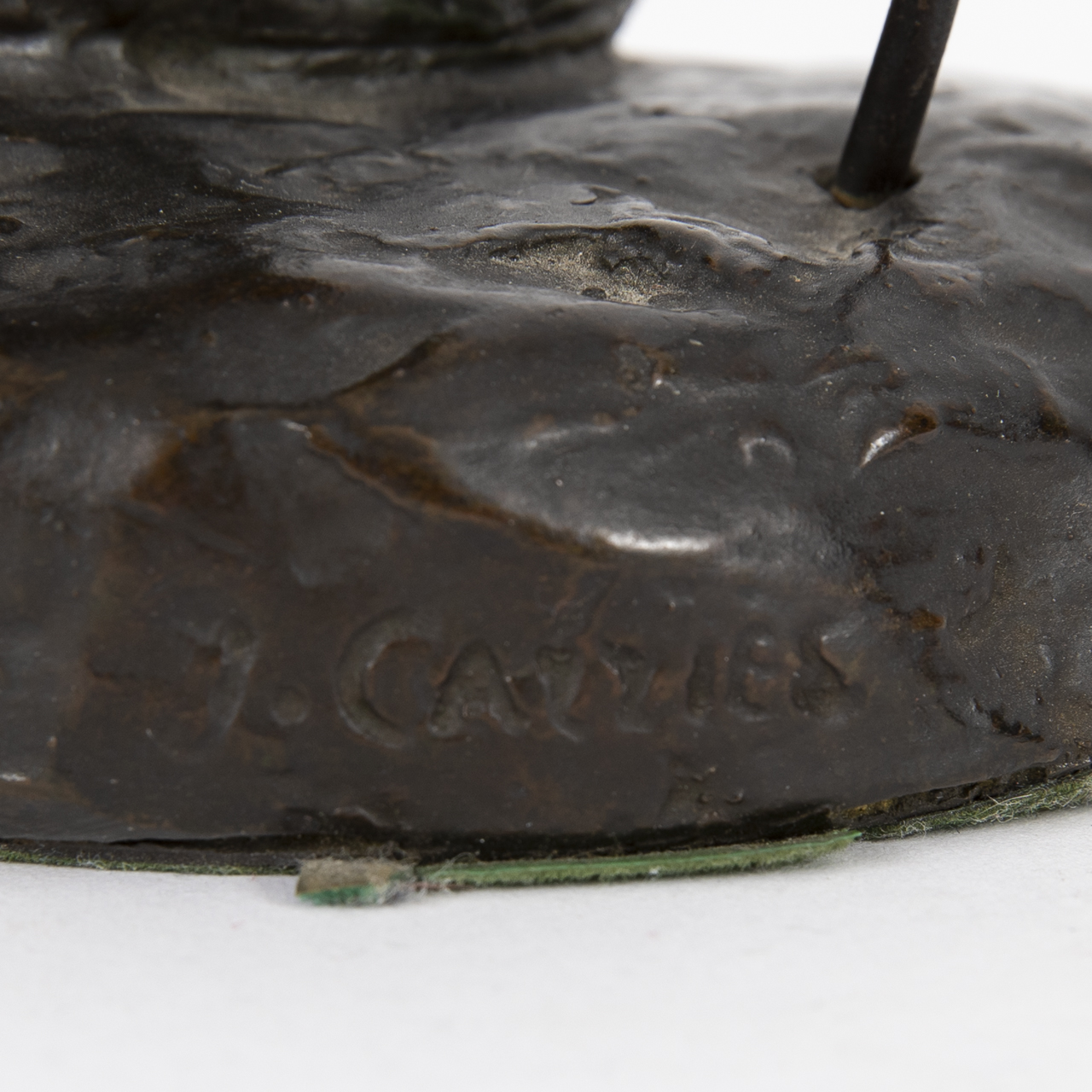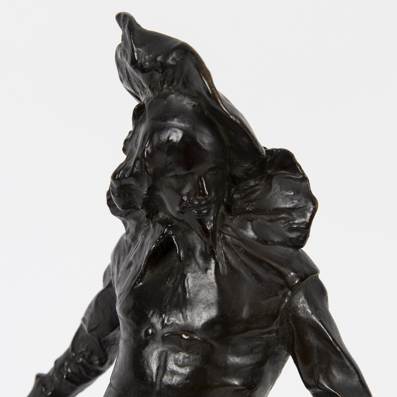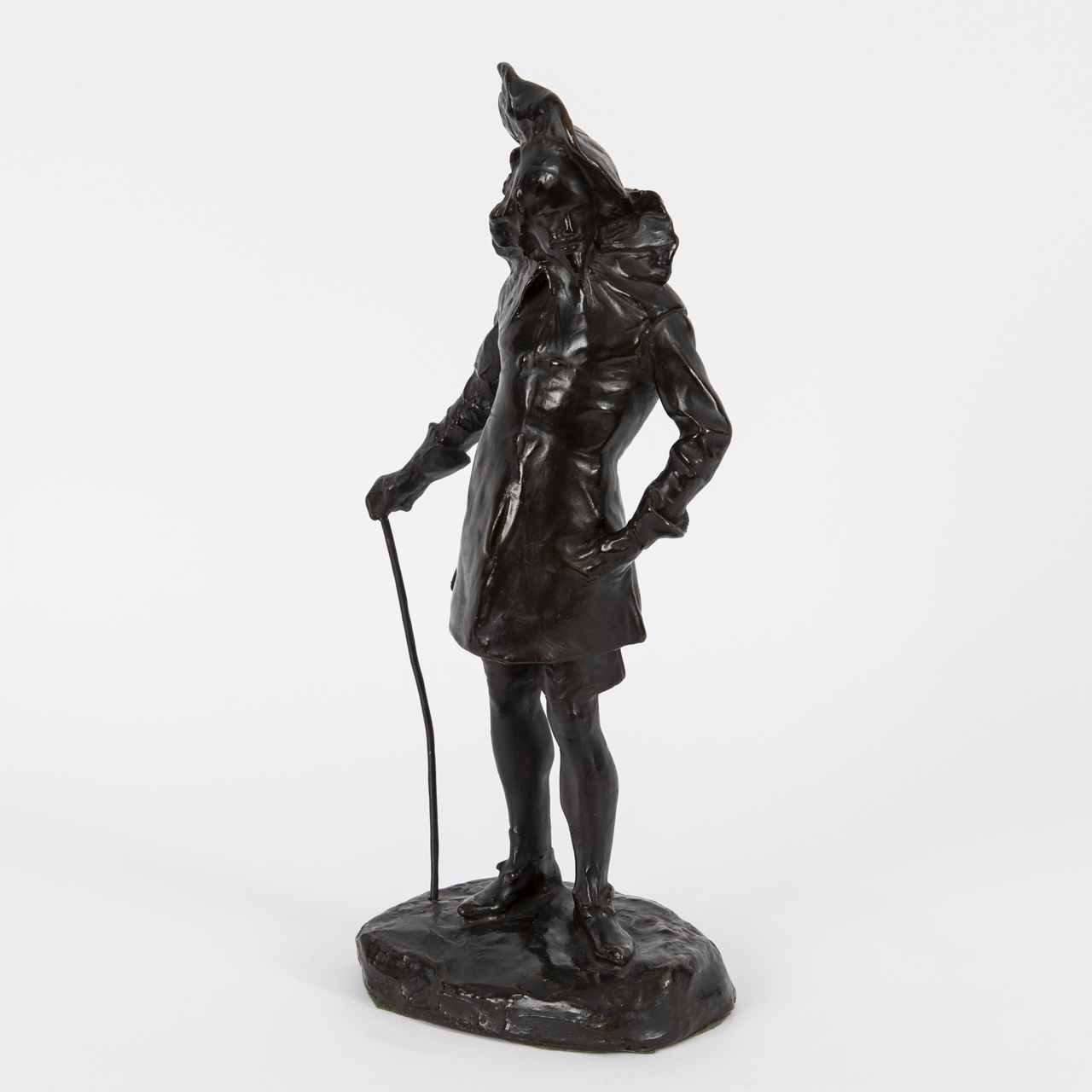 Bronze braun patiniert; „Le Gentilhomme dit le Callot“; figürliche Darstellung eines Herren mit Spitzbart in historischer oder allegorischer Kleidung, mit theatralischen Zügen, der Kopf ist leicht geneigt, der Blick nach unten gerichtet, eine Hand sich auf einem langen Stab abstützend; seitlich am Sockel signiert; Oberfläche leicht berieben, Stab leicht verbogen; Höhe: ca. 32,8 cm; Gewicht: ca. 2549 g.